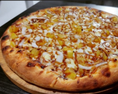 Pizza de 12 porciones, ingredientes: queso mozzarella, salsa pizzera, pollo, jamón, piña, cebolla blanca y salsa BBQ.
