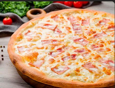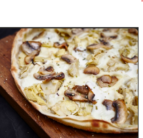Pizza de 8 porciones. Ingredientes: salsa blanca, queso mozzarella, tocino y champiñones.