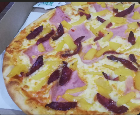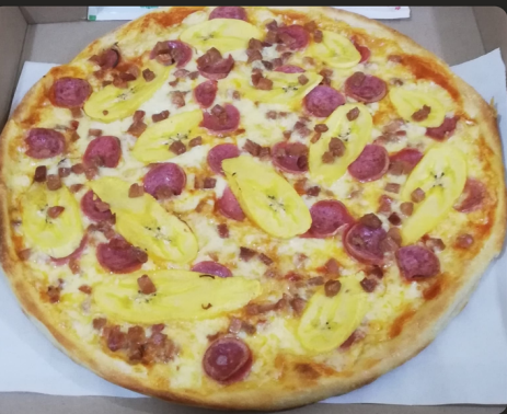 Pizza de 12 porciones. Ingredientes: queso mozzarella, salsa pizzera, plátano, cecina ahumada y chorizo ahumado.