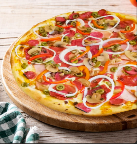 Pizza de 8 porciones. Ingredientes: salsa pizzera, queso mozzarella, cebolla blanca, pimiento, aceitunas verdes y maíz dulce.