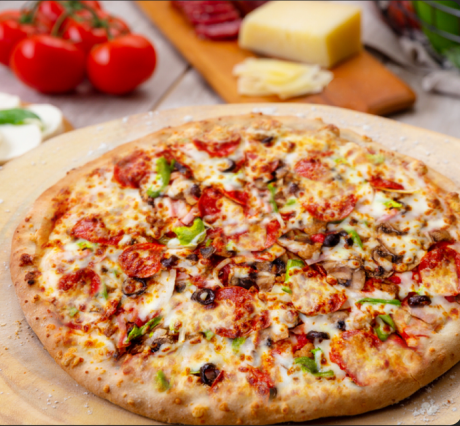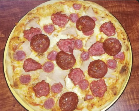 Pizza de 12 porciones. Ingredientes: salsa pizzera, queso mozzarella, lomo ahumado, salame, chorizo y pepperoni.
