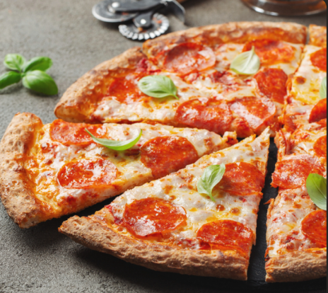 Pizza de 12 porciones. Ingredientes: queso mozzarella, salsa pizzera y pepperoni.