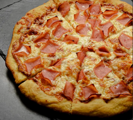Pizza de 8 porciones. Ingredientes: queso mozzarella, salsa pizzera y jamón.