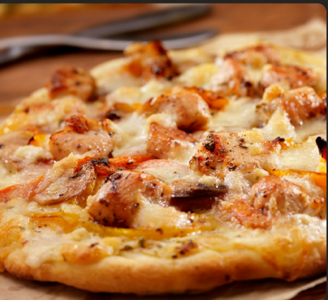 Pizza de 8 porciones. Ingredientes: queso mozzarella, salsa pizzera, pollo, jamón, piña, cebolla blanca y salsa BBQ.