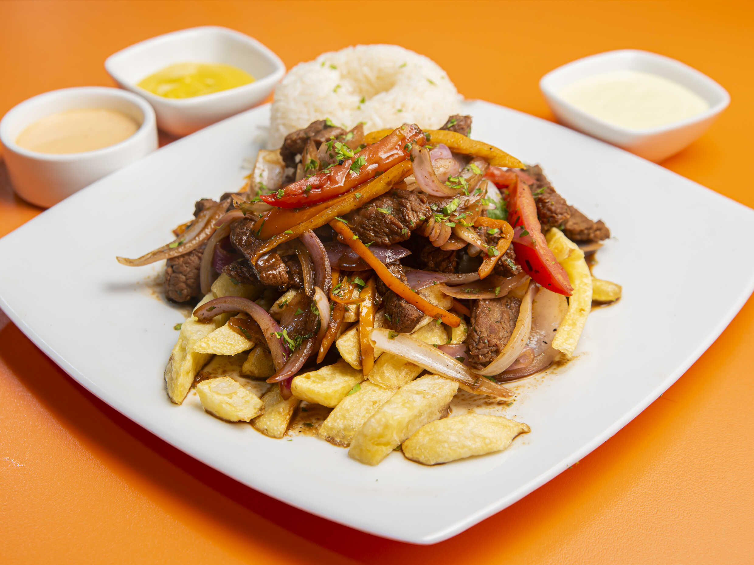 Carne en trozos salteados con sillao, cebolla y tomate, acompañado con arroz, papas fritas y 5 cremas a elección.