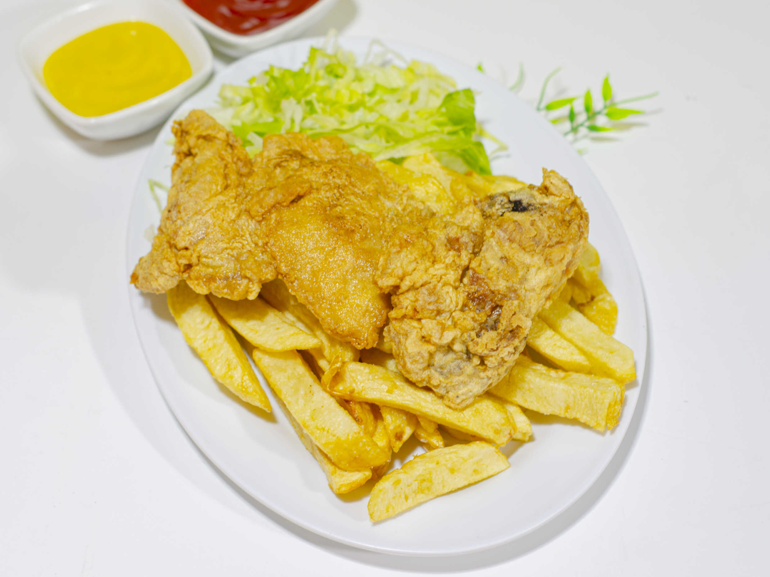Pieza de pierna, papas fritas y arroz blanco. Opcional, ensalada de lechuga y 5 cremas a elección.