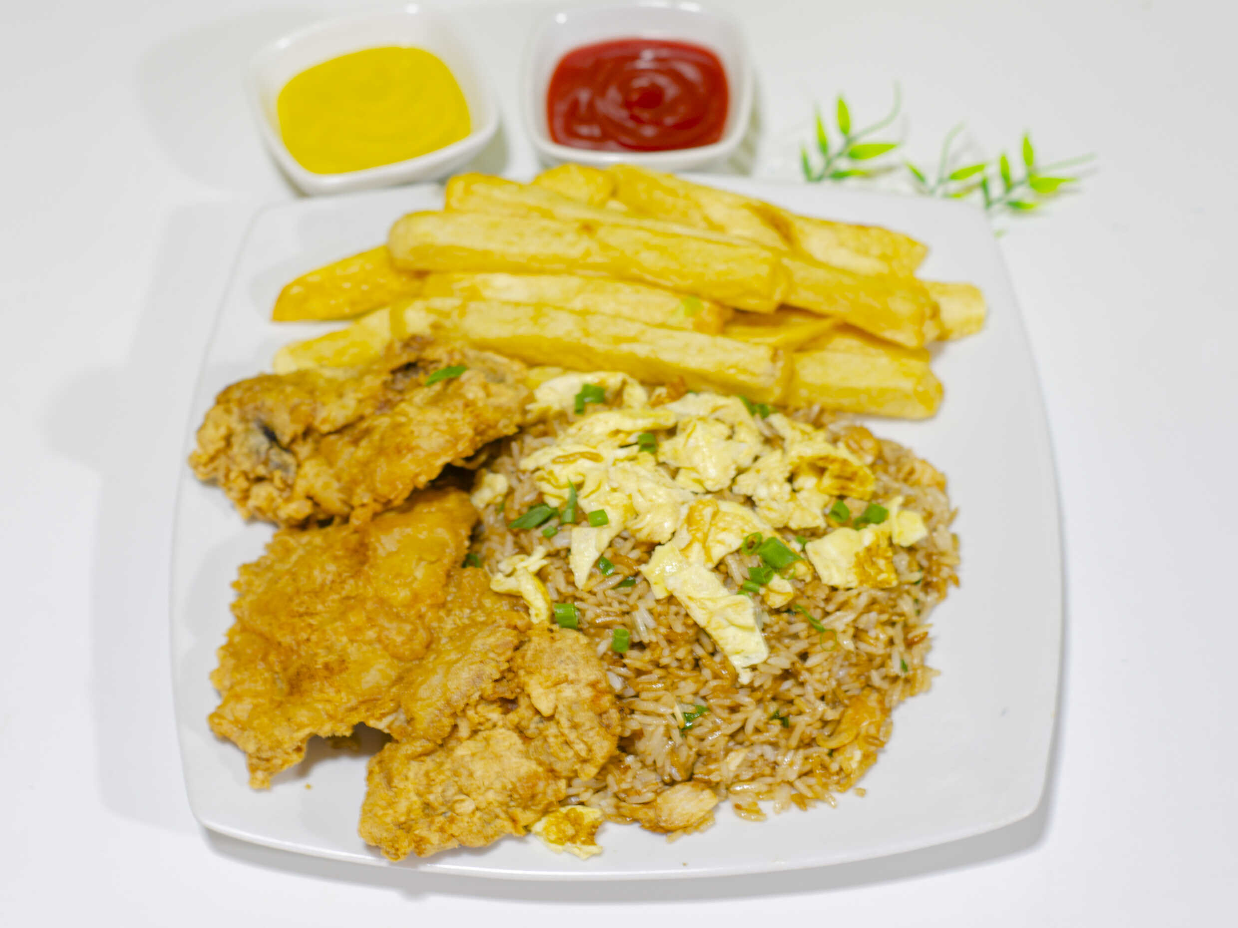 1 Alita broaster, papas fritas acompañadas con porción personal de arroz chaufa de pollo, ensalada de lechuga y 5 cremas a elección.