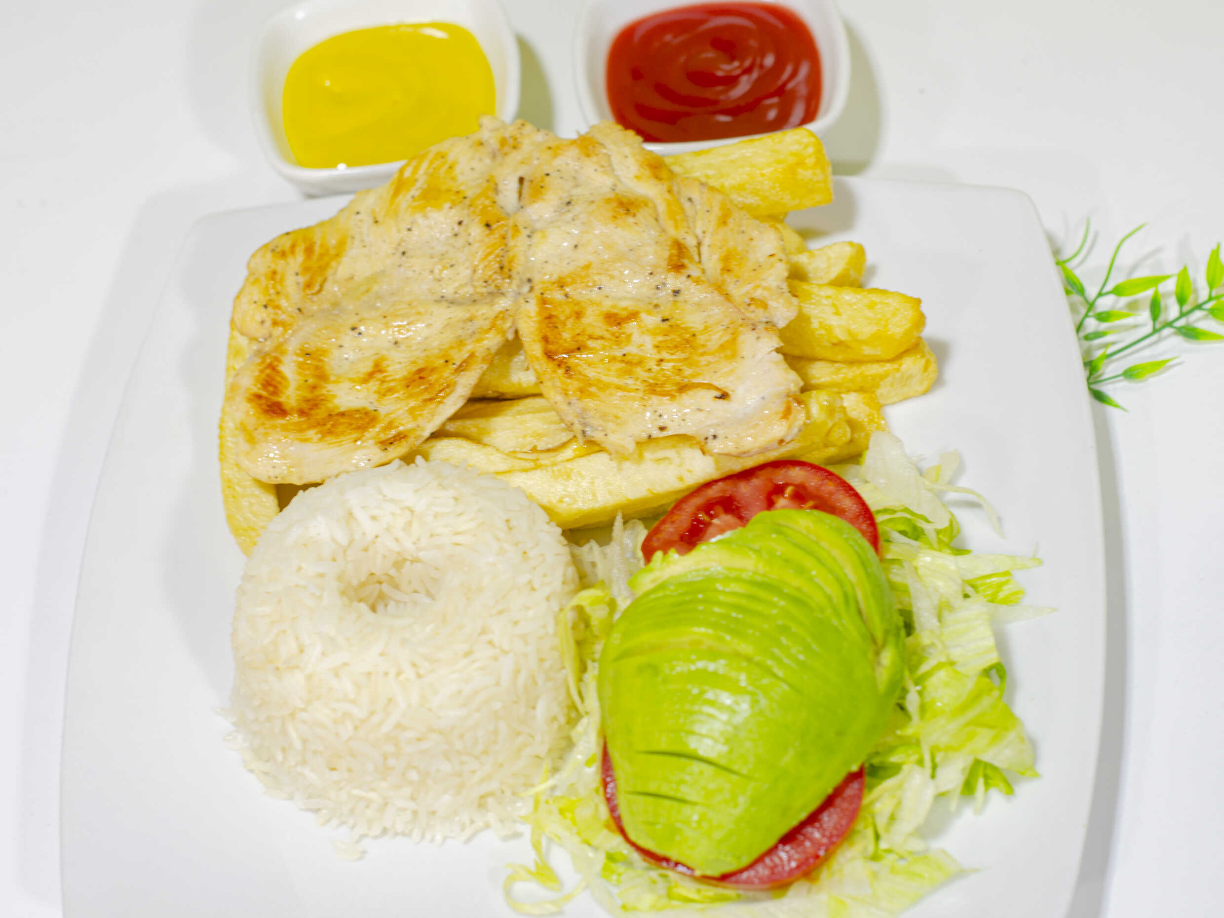 Filete de pechuga de pollo a la plancha, papas fritas, ensalada de lechuga, tomate y palta, acompañada de arroz blanco con 5 cremas a elección.