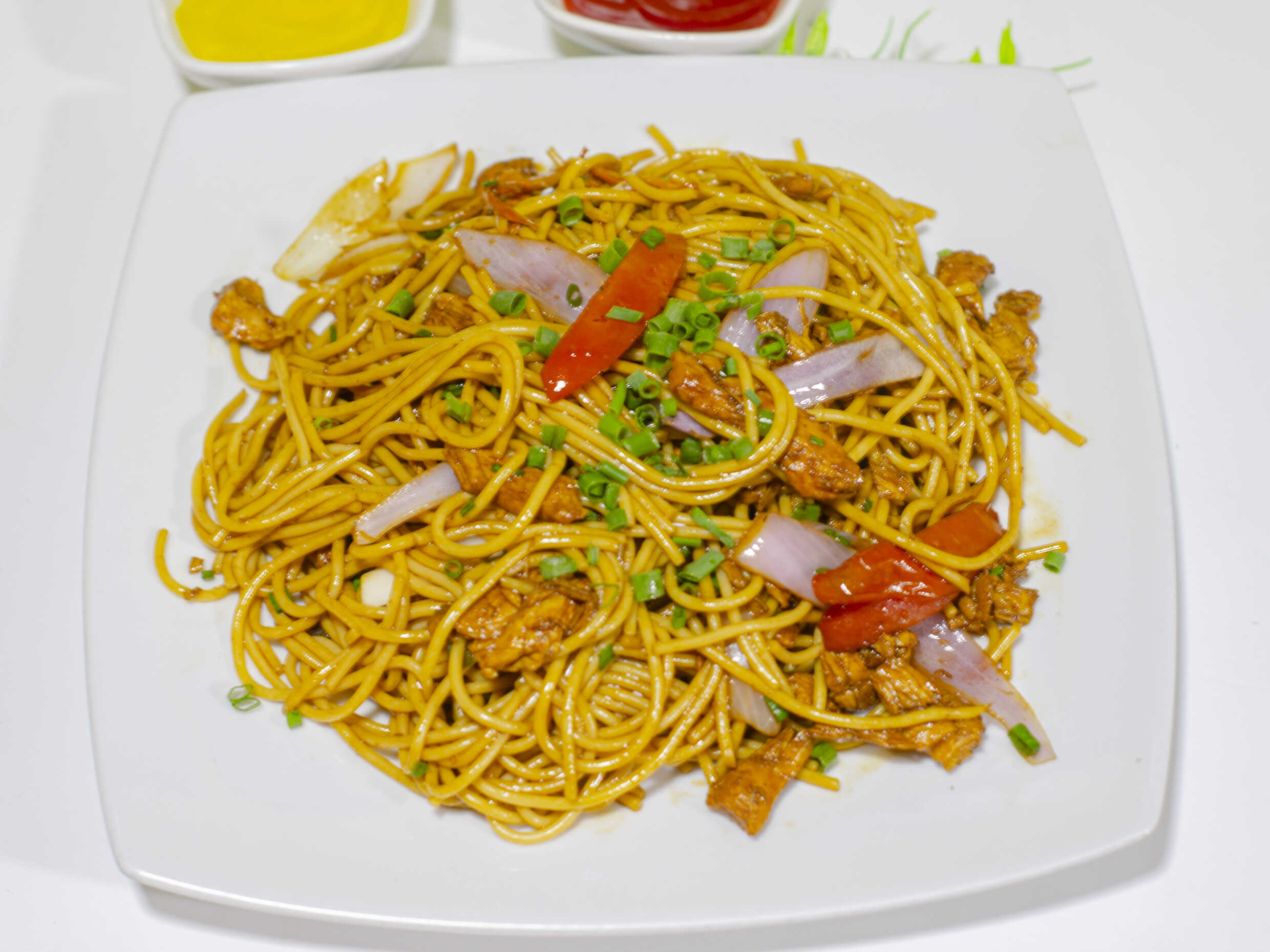 Pollo en trozos salteados con sillao, cebolla y tomate, acompañado con tallarines y 3 cremas a elección.