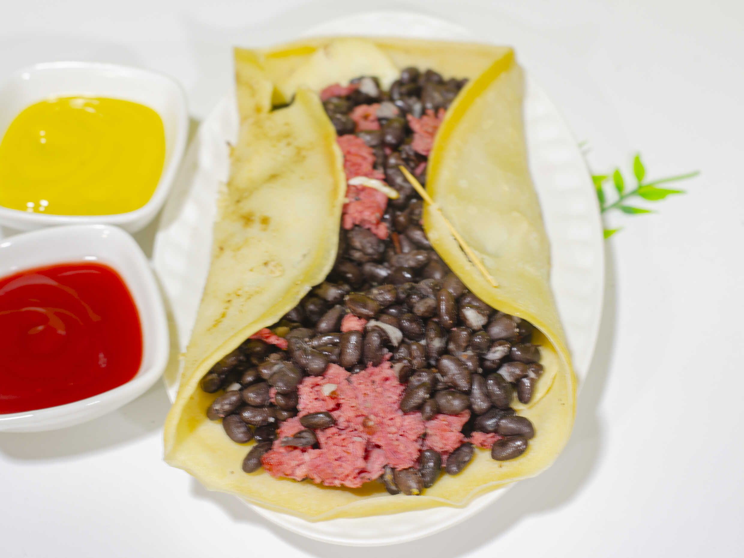 Tortilla de maíz, 2 quesos danbo, frejoles negros, filete de pechuga de pollo a la plancha y chorizo con 5 cremas a elección.