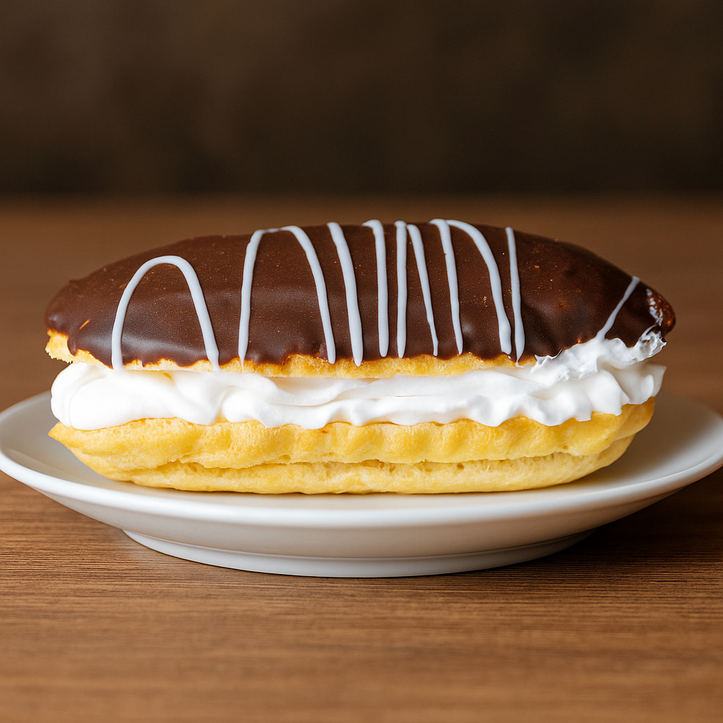 Eclair de pasta choux relleno con crema pastelera y chantilly. Bañado en chocolate.