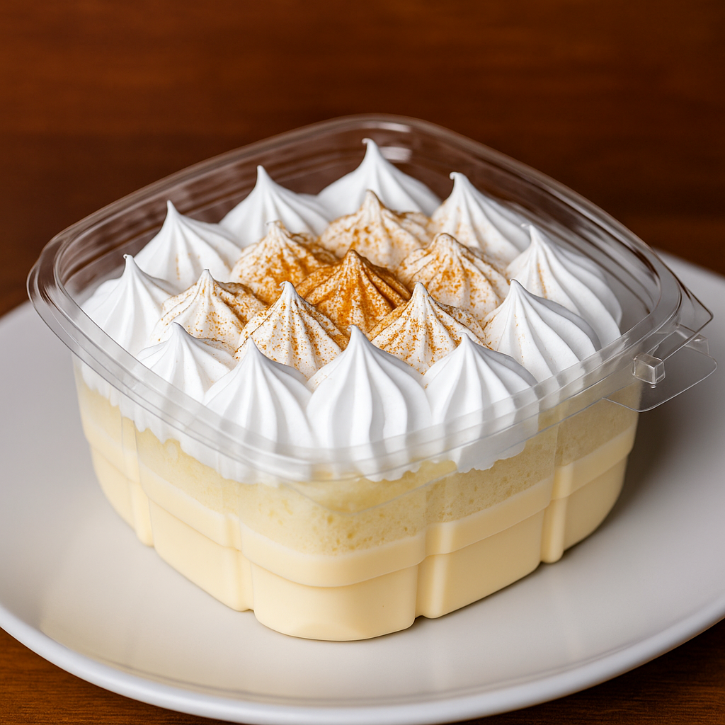 Bizcocho bañado con leche evaporada, crema de leche, leche condensada, cubierto con chantilly y espolvoreado con canela.
