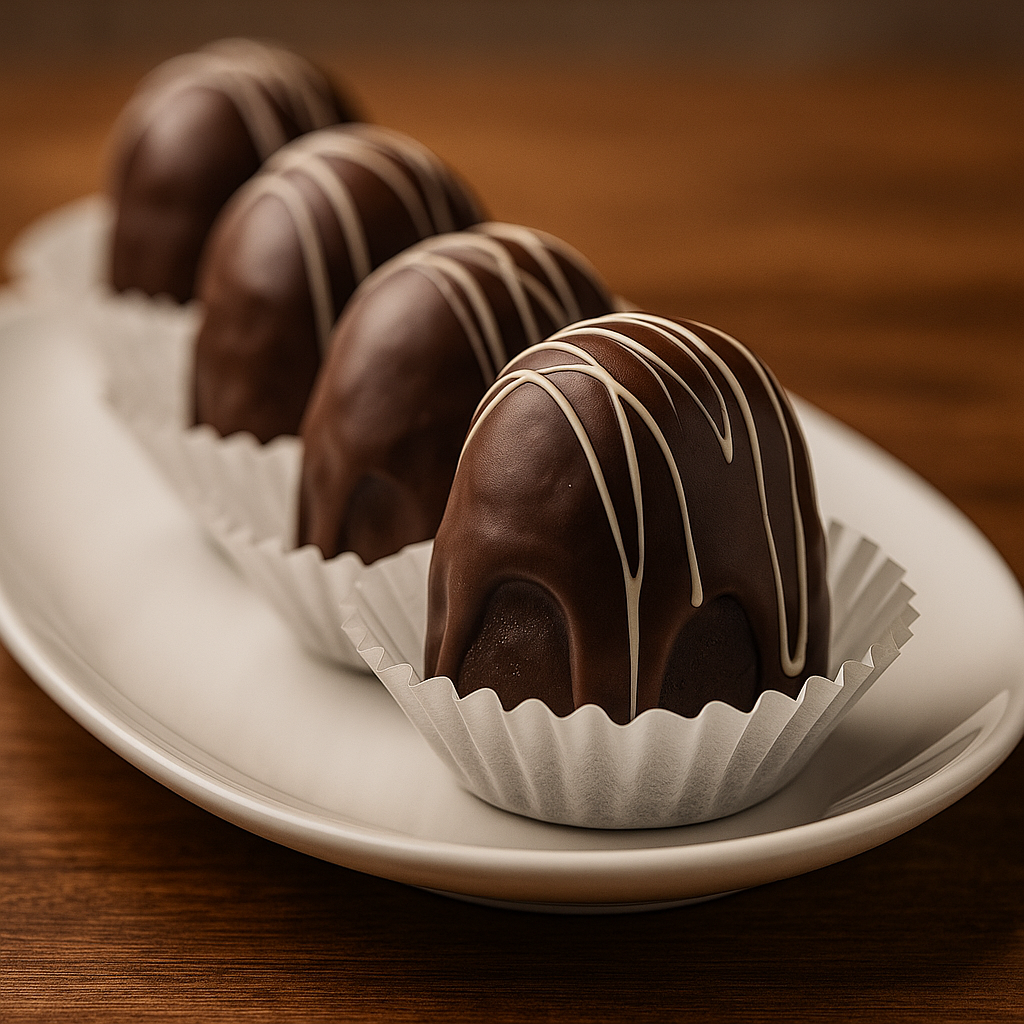 Trufa de chocolate con ron, pisco peruano y cubierto de chocolate blanco.