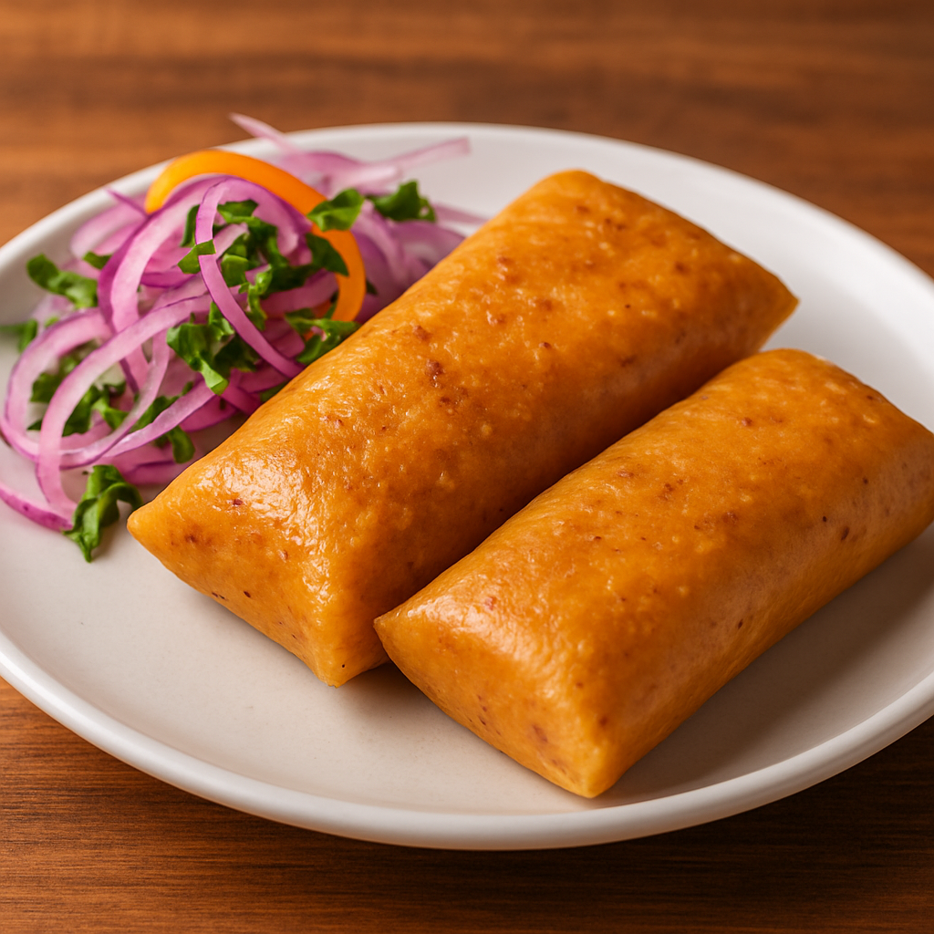 Tamal de maíz con chancho o pollo acompañado con salsa de cebolla criolla.