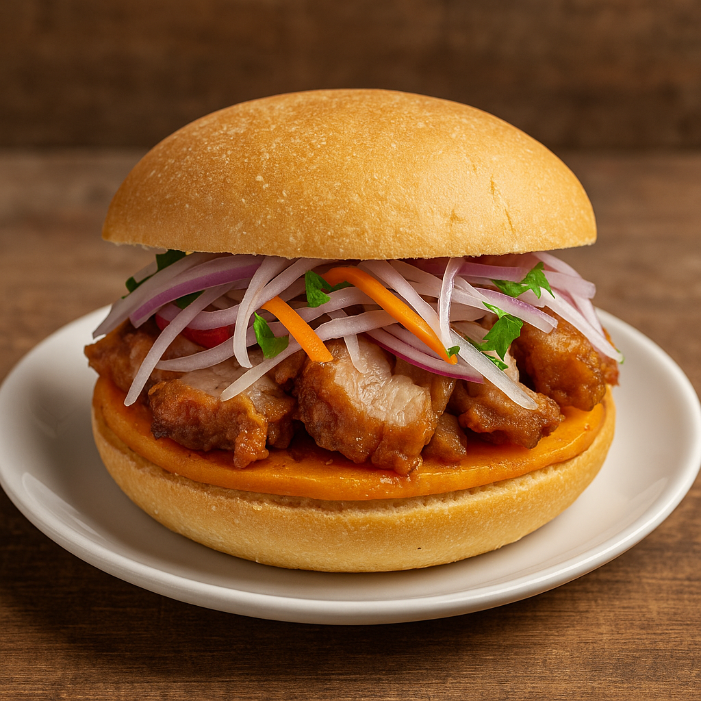 Sándwich de chicharrón en pan crocante acompañado con salsa de cebolla y camote frito.