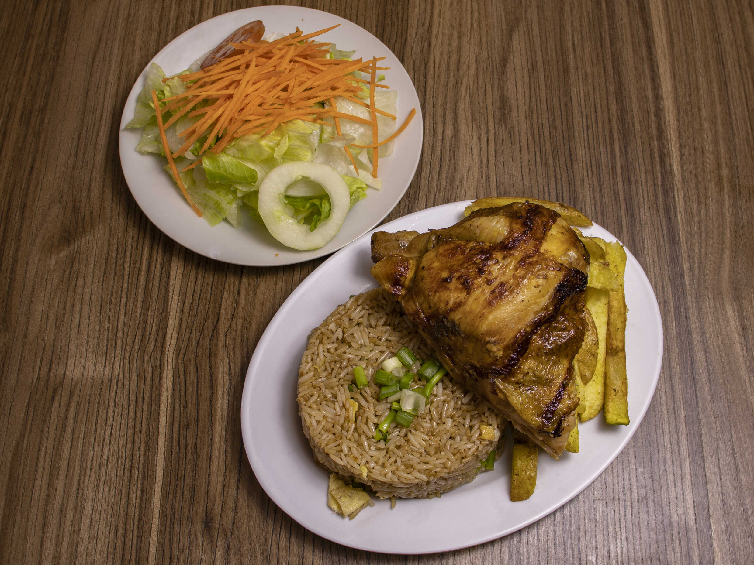 1 Cuarto de pollo, porción de papas amarillas, chaufa, y cremas.