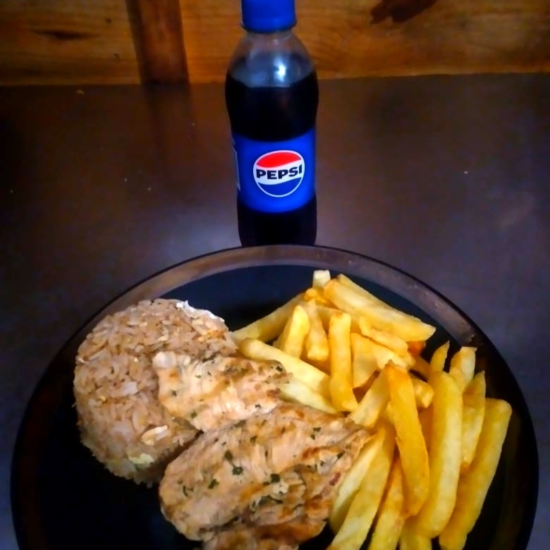 Pechuga Parrillera (90gr) con papas fritas y arroz chaufa.