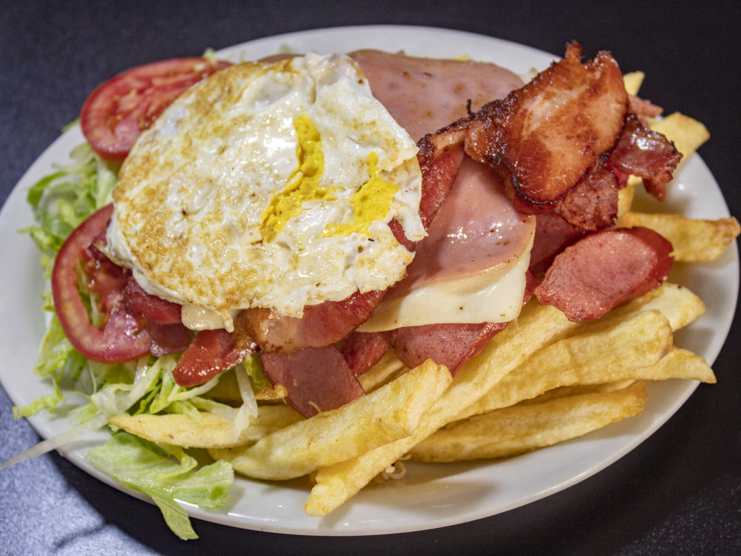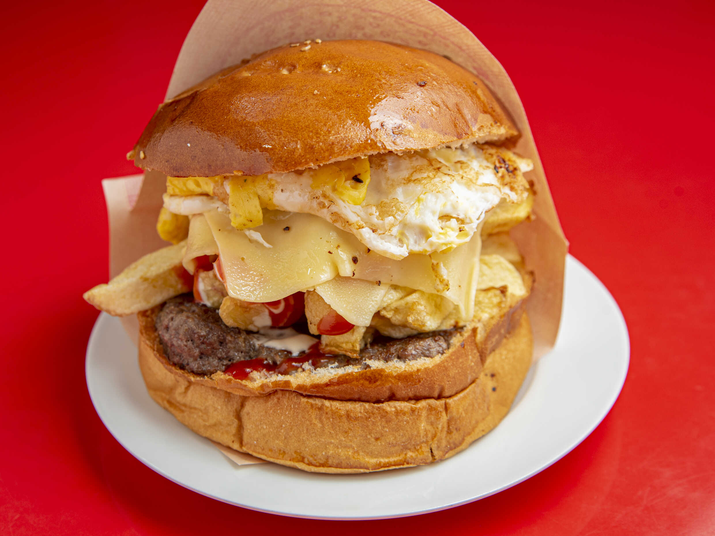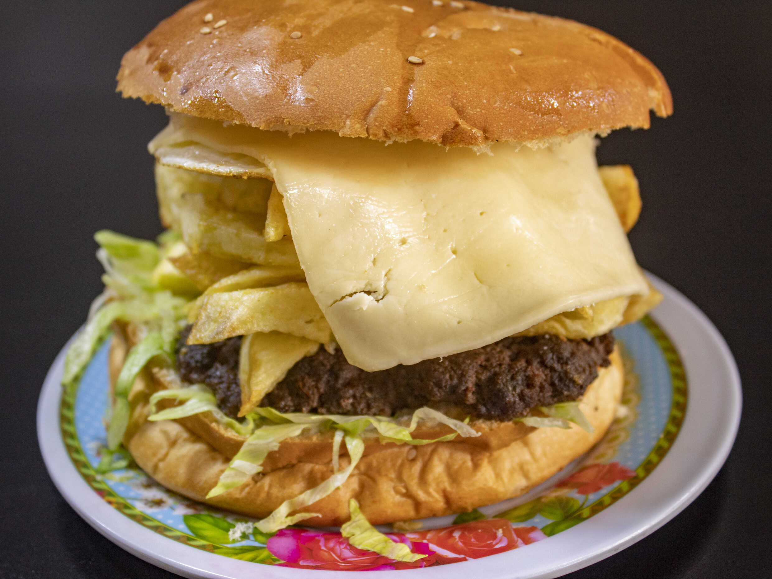 Hamburguesa de carne, huevo, queso, papas fritas, ensalada y salsas.