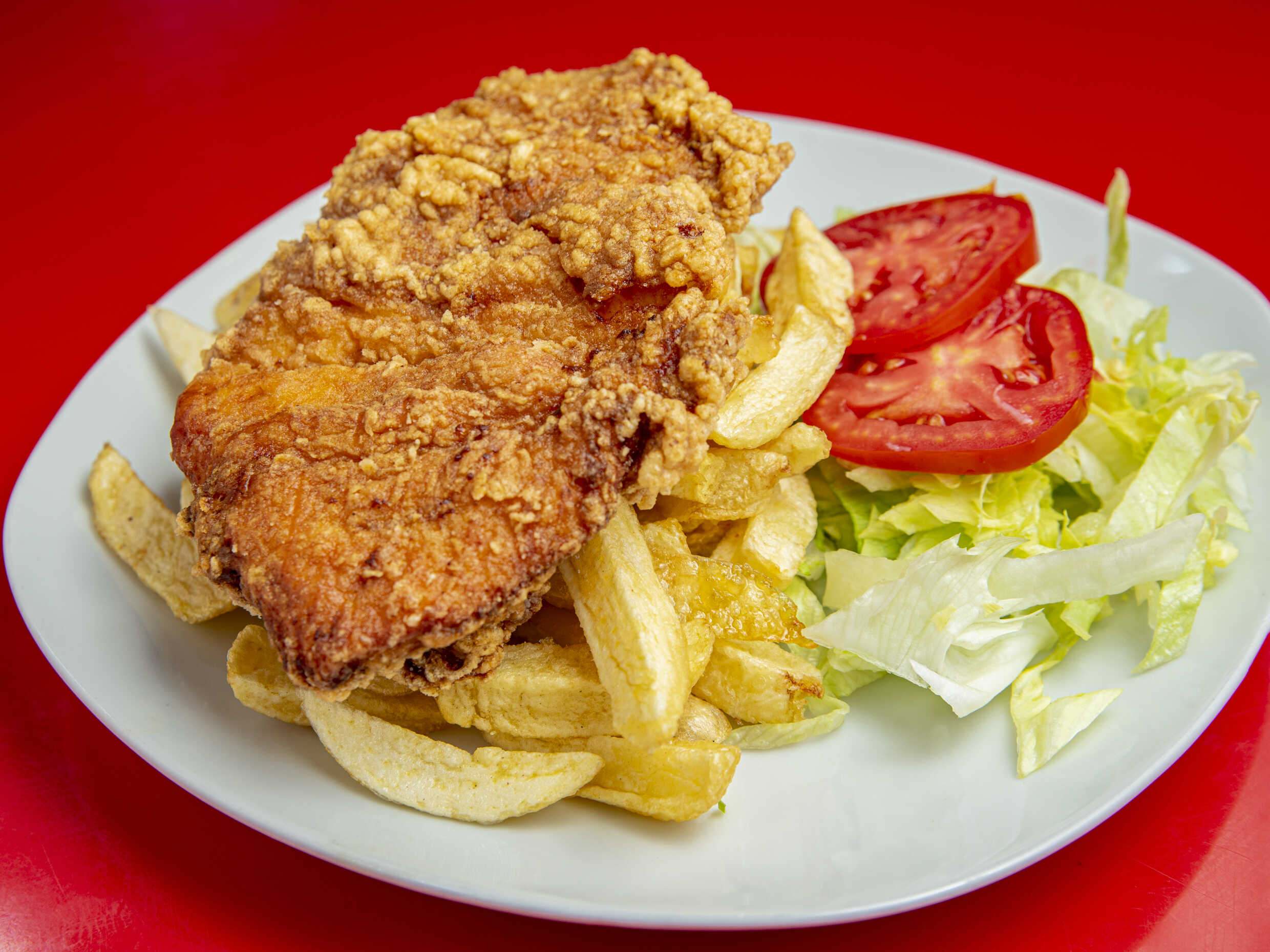 Filete de Pollo, plátano, huevo, jamón, queso, papas fritas, ensalada y salsas.