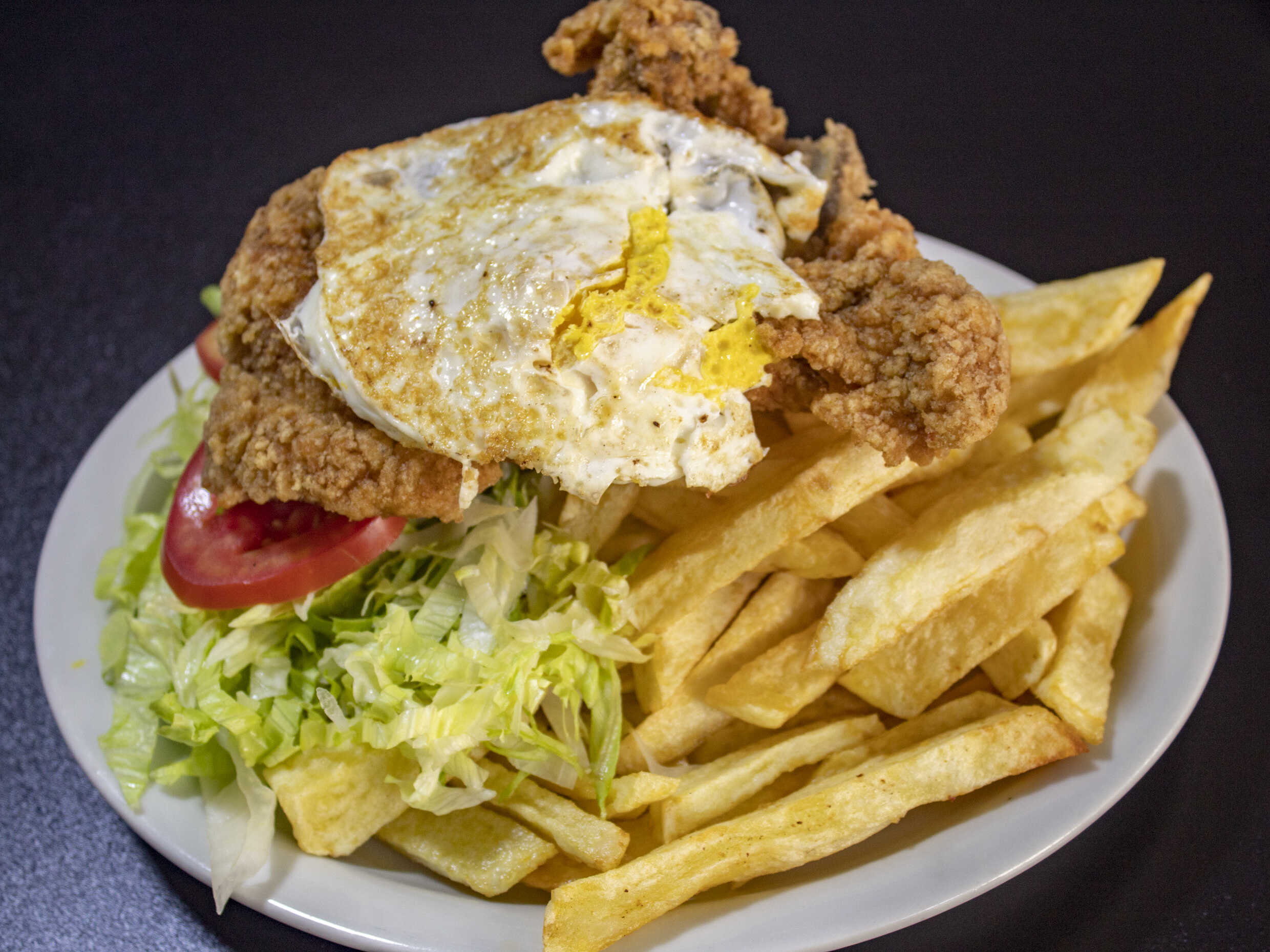 Filete de pollo, huevo, papas fritas, ensalada y salsas.