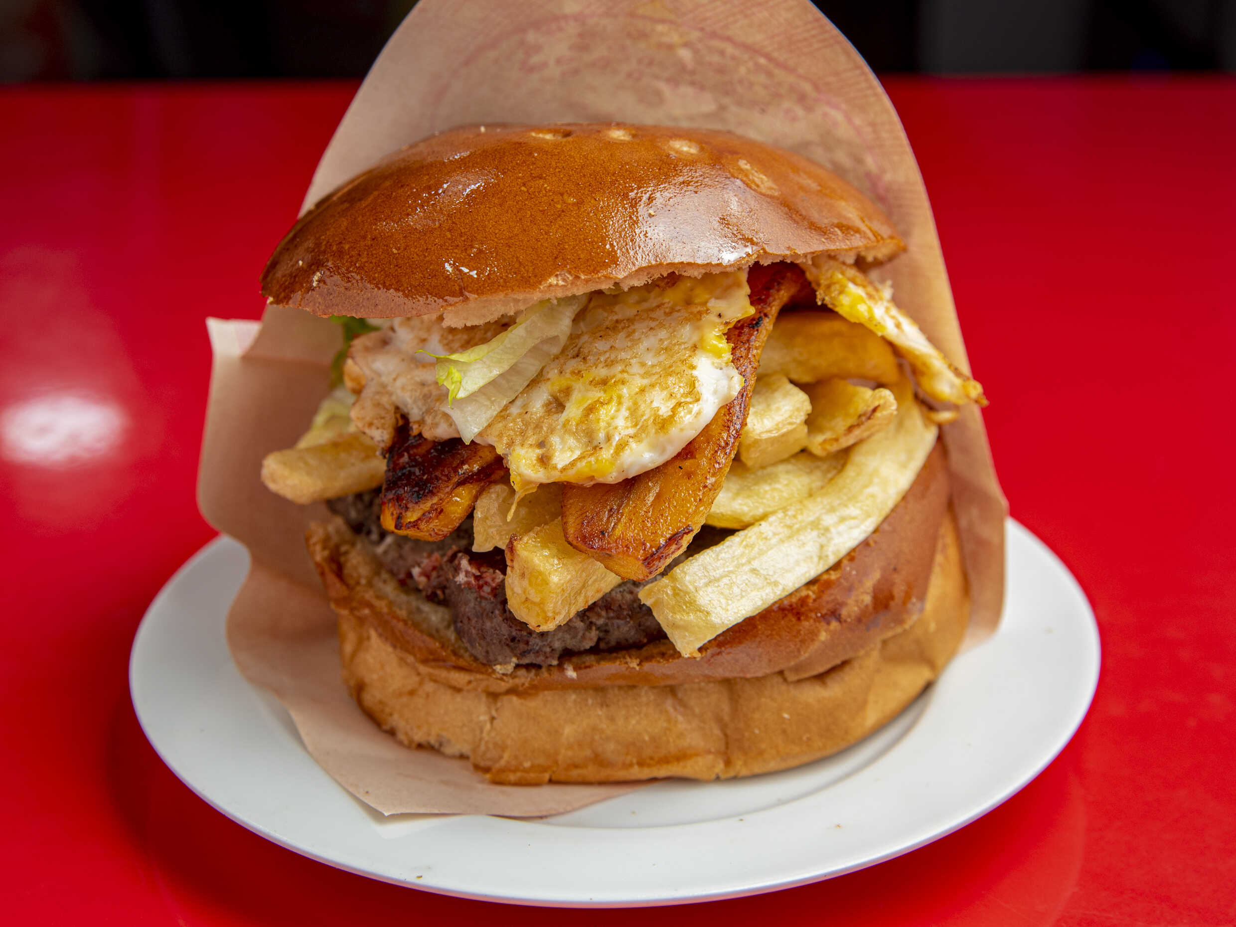 Hamburguesa de carne, plátano, huevo, papas fritas, ensalada y salsas.