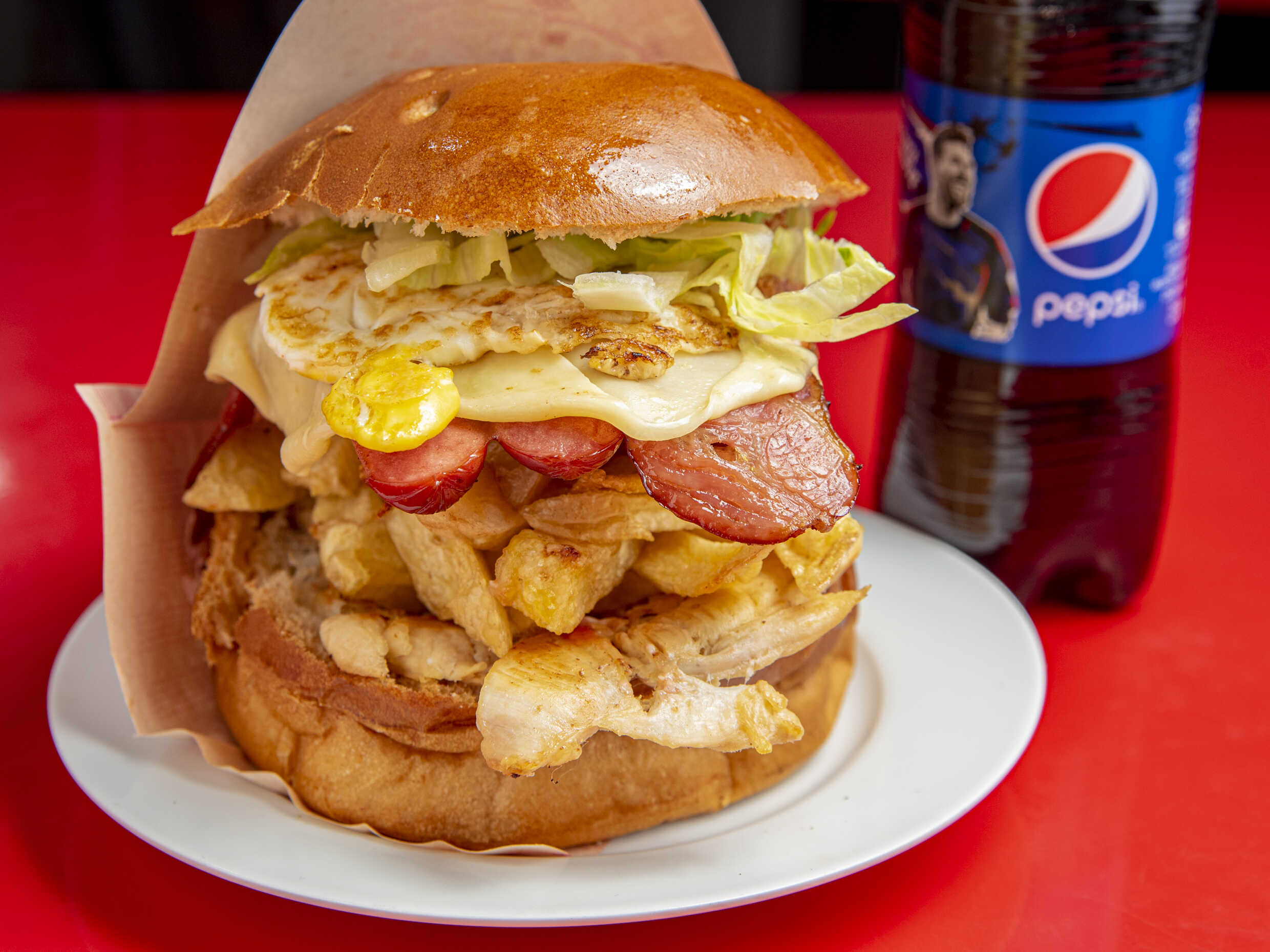1 Filete de pollo, 1 Hamburguesa de carne, 1 huevo, 2 quesos, 2 jamones y gaseosa 500 ml.
