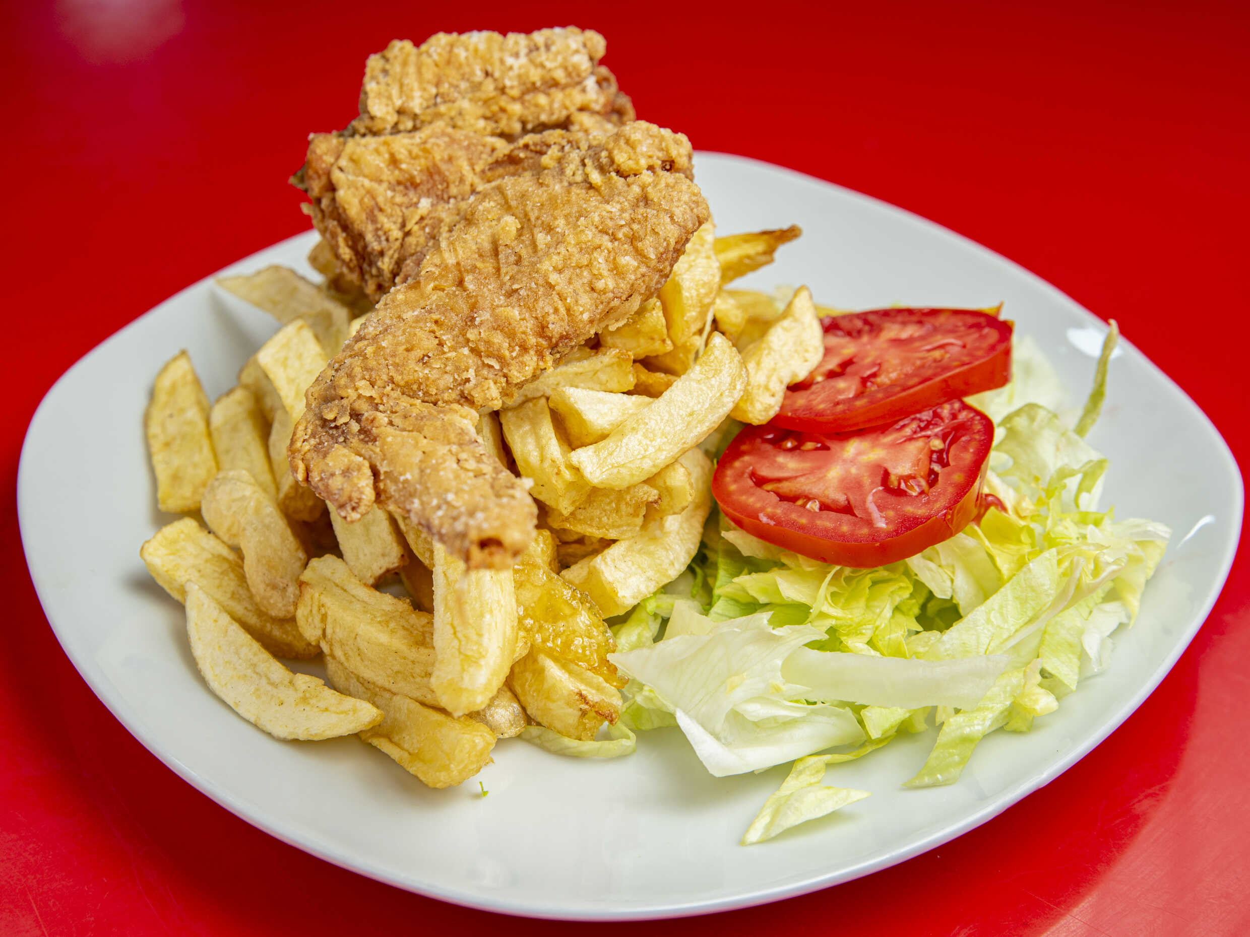 Pecho broaster, papas fritas, ensalada y salsas.