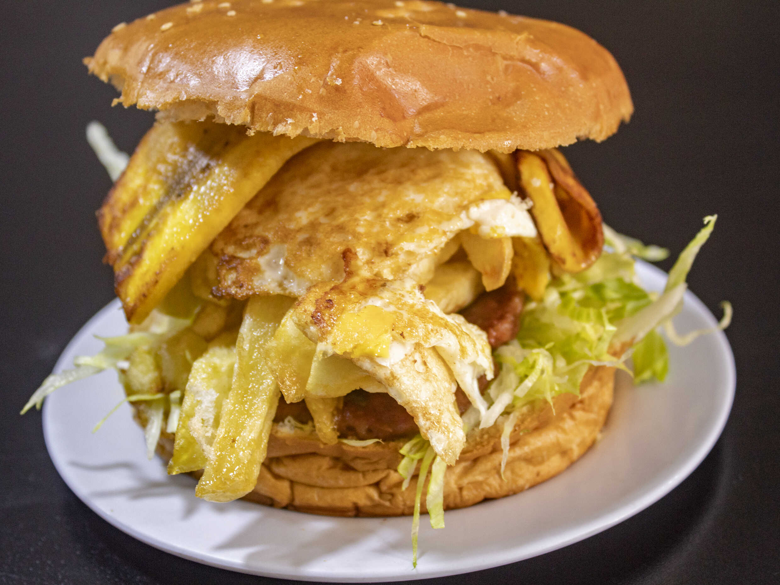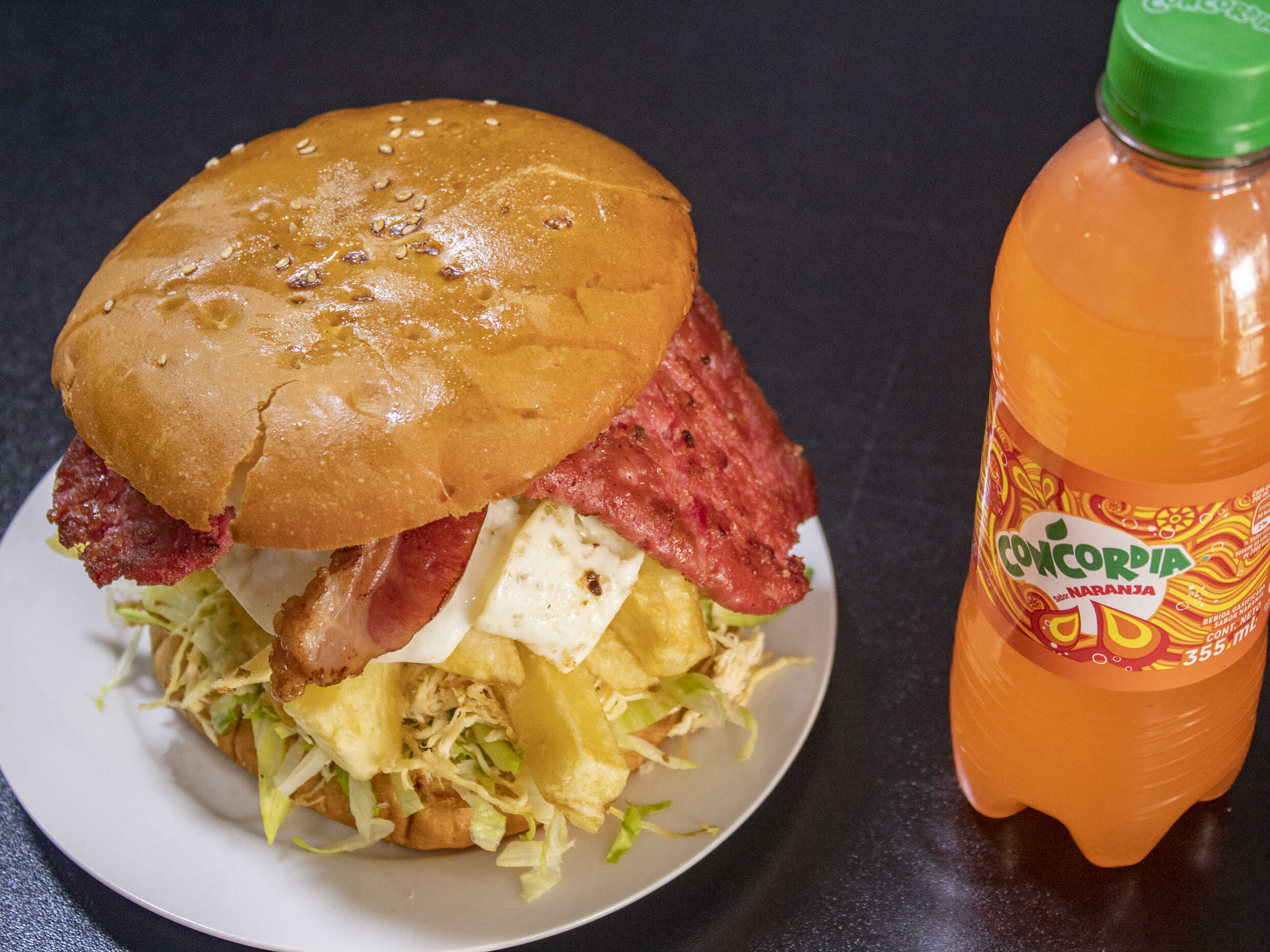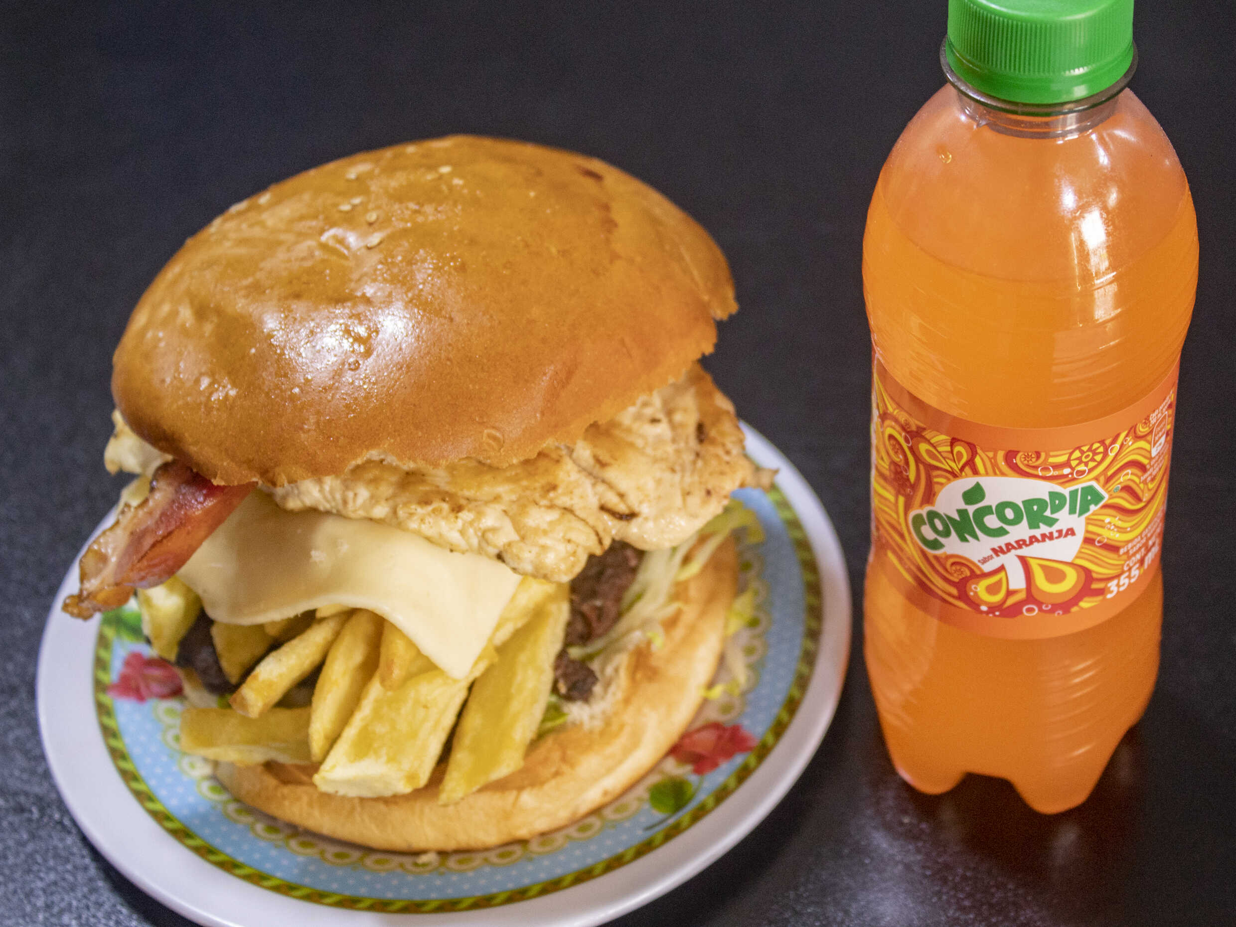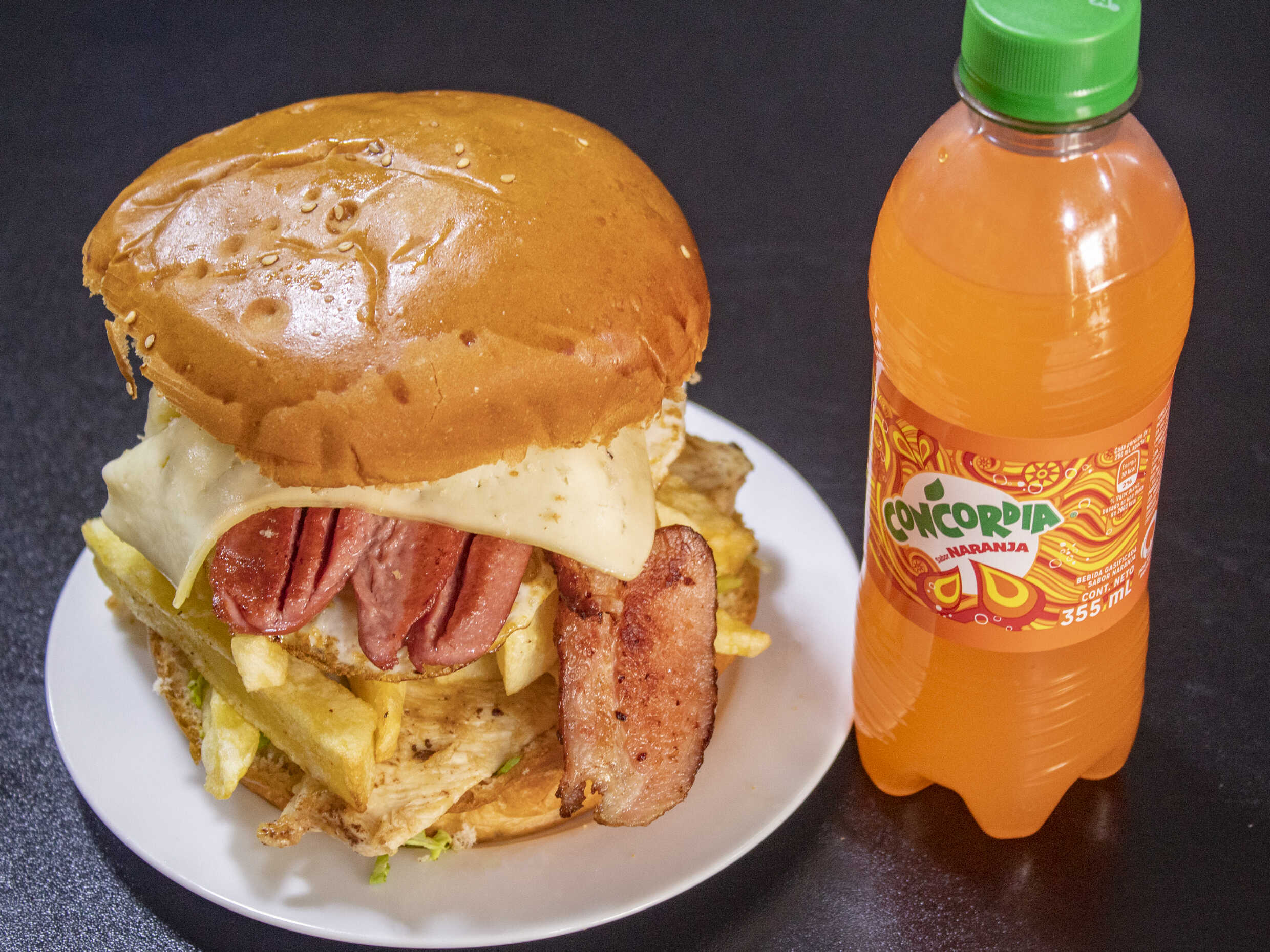 1 Carne de casa, 1 queso, 1 huevo frito, 1 hot dog y 1 Pepsi 335 ml.