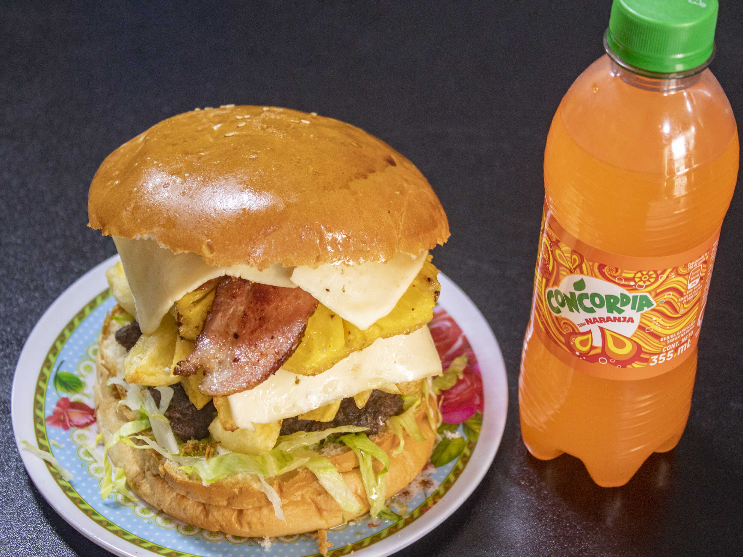 1 Carne de casa, 1 rodaja de piña, 2 quesos, 1 tocino y 1 Pepsi 335 ml.