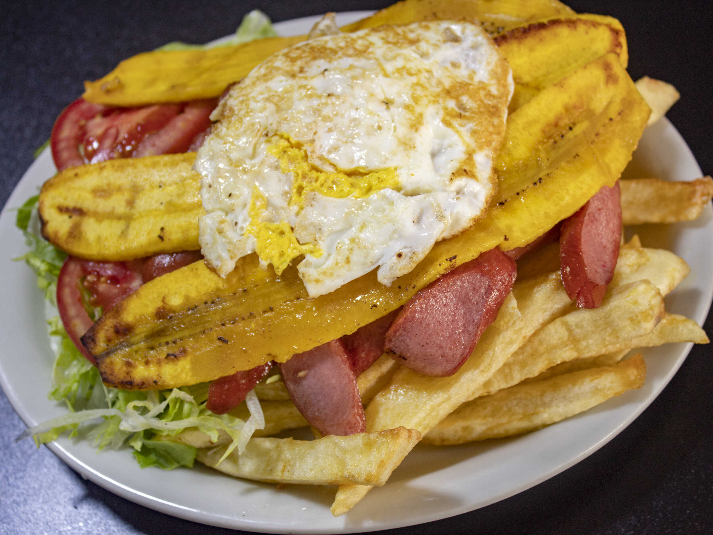 Papas fritas, hot dog, huevo, plátano, ensalada y salsas.