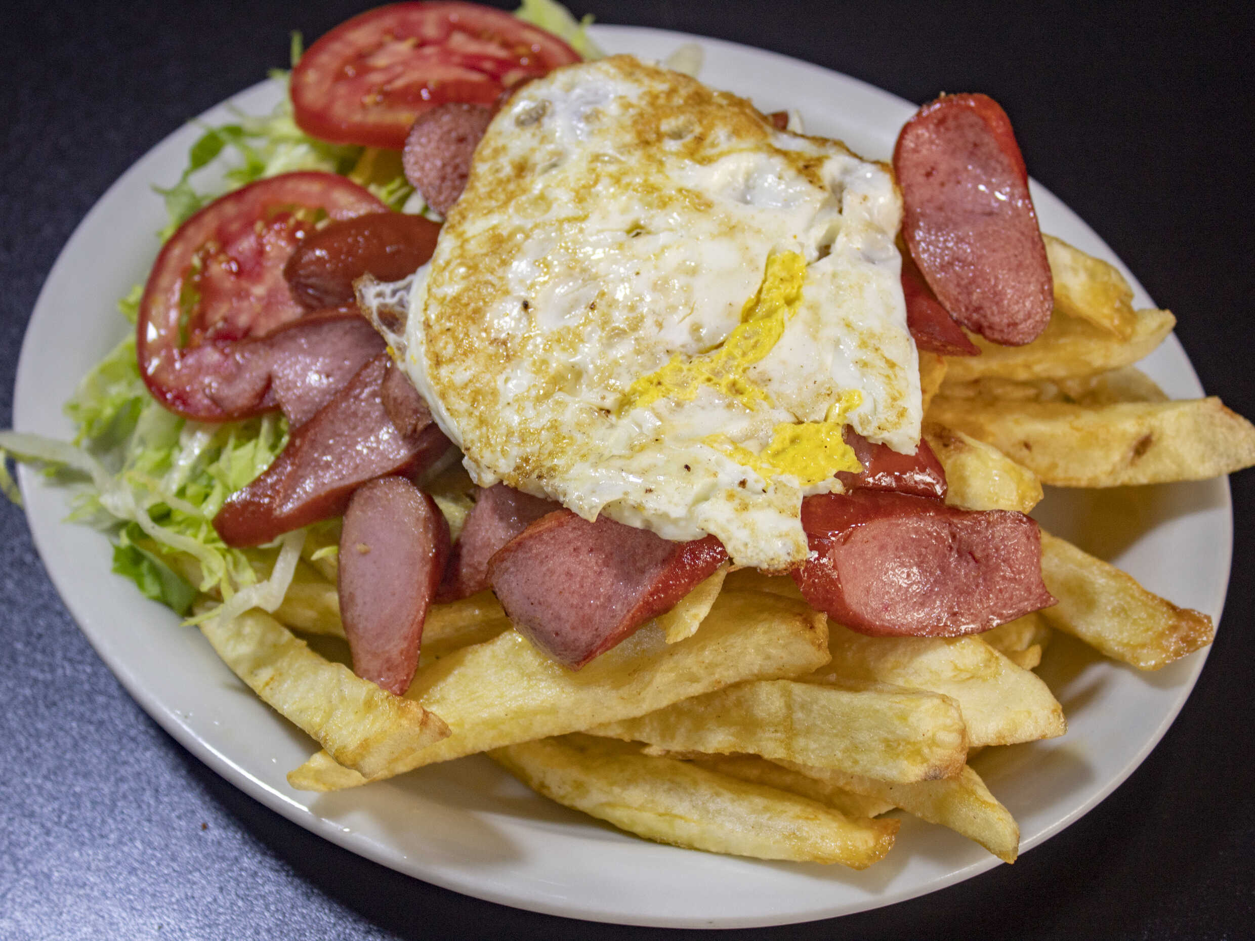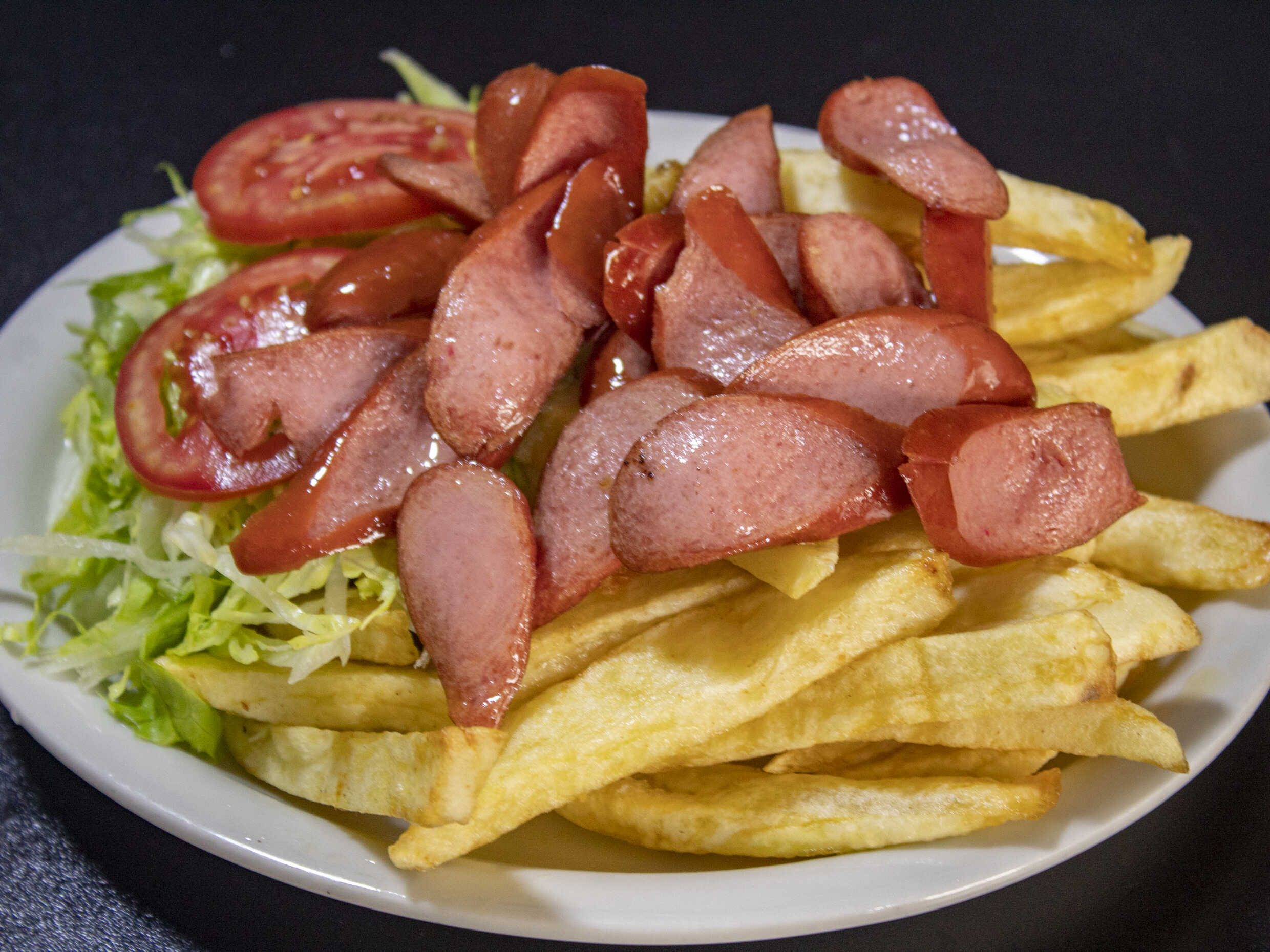 Papas fritas, chorizo, carne de casa, filete de pollo, hot dog, huevo, ensalada y salsas.