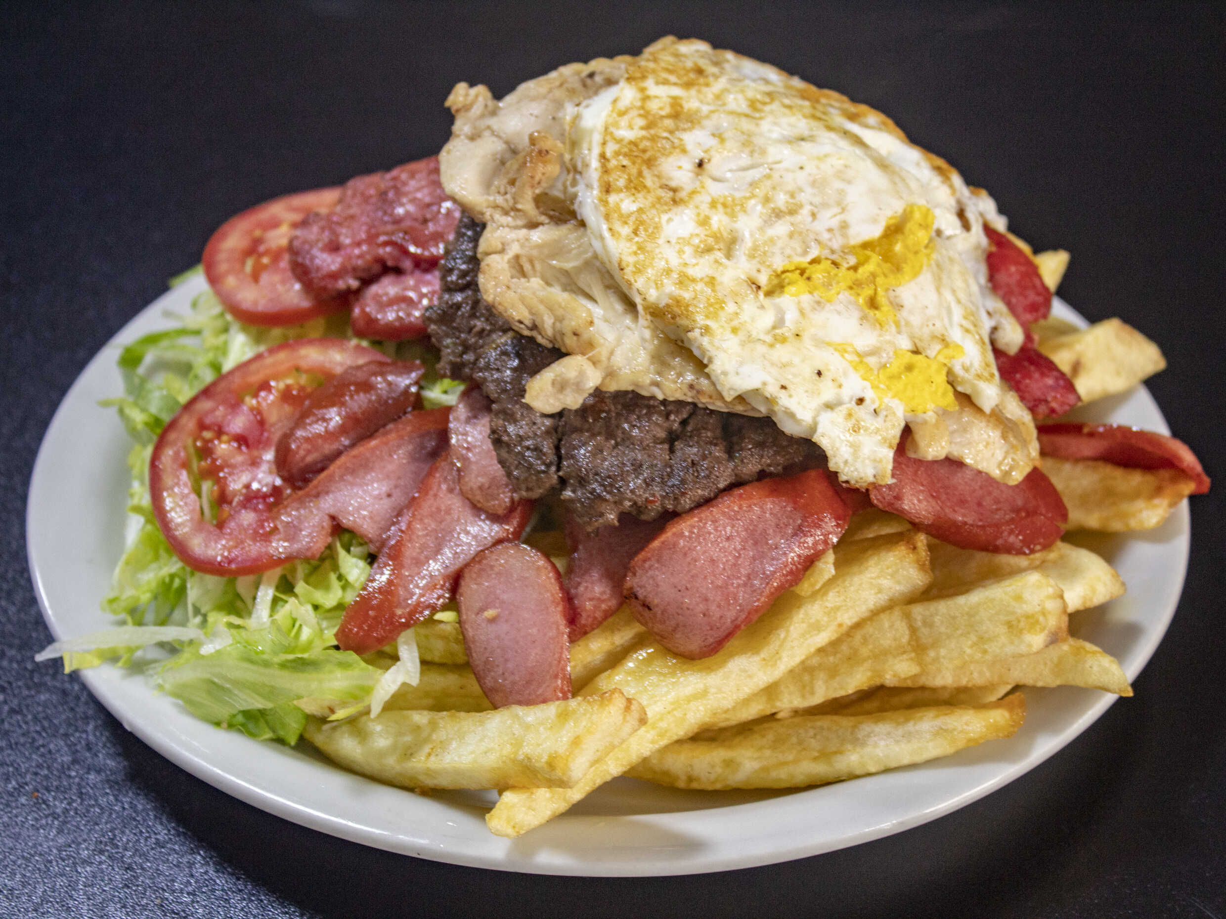 Hamburguesa de casa, huevo o queso o jamón, papas, ensalada y salsas.