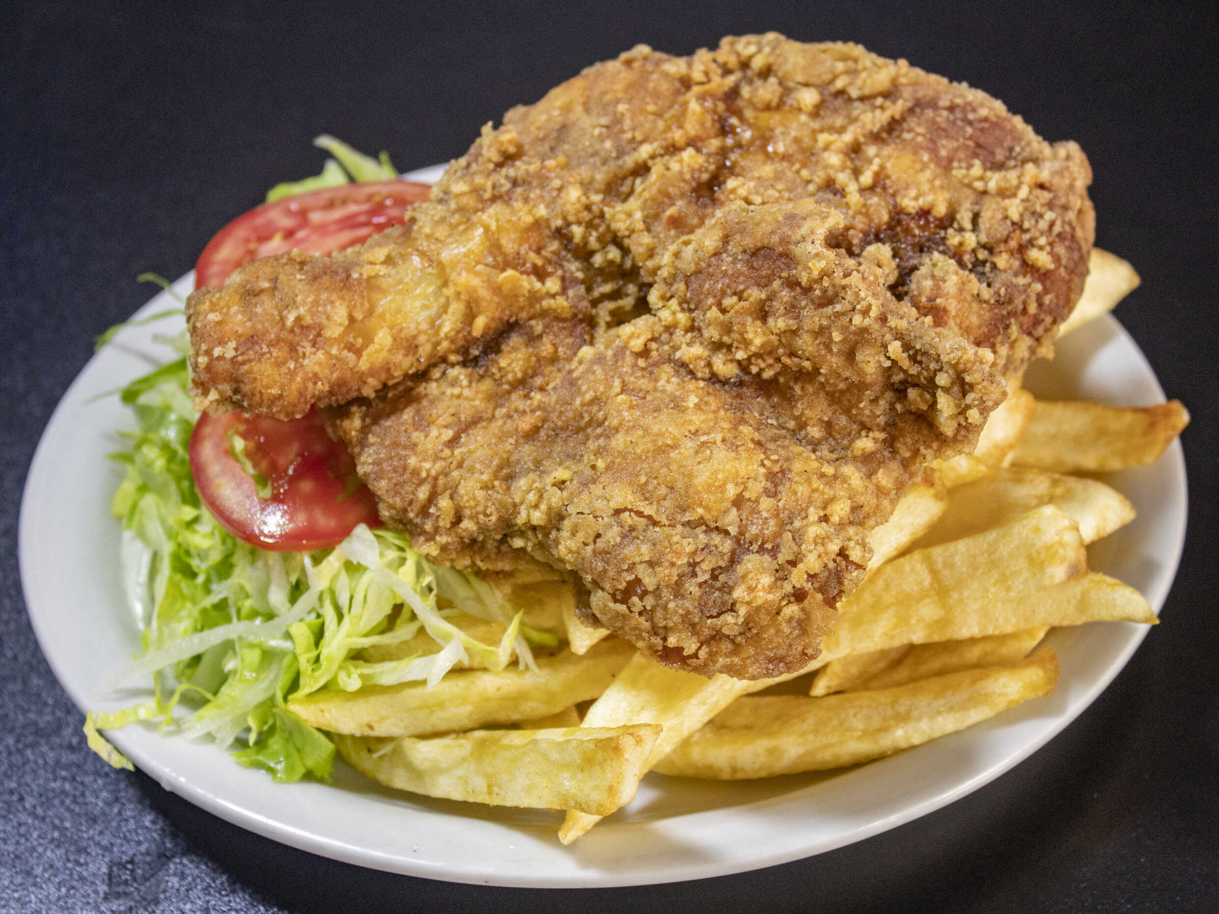 Filete de pollo, huevo o queso o jamón, papas, ensalada y salsas.
