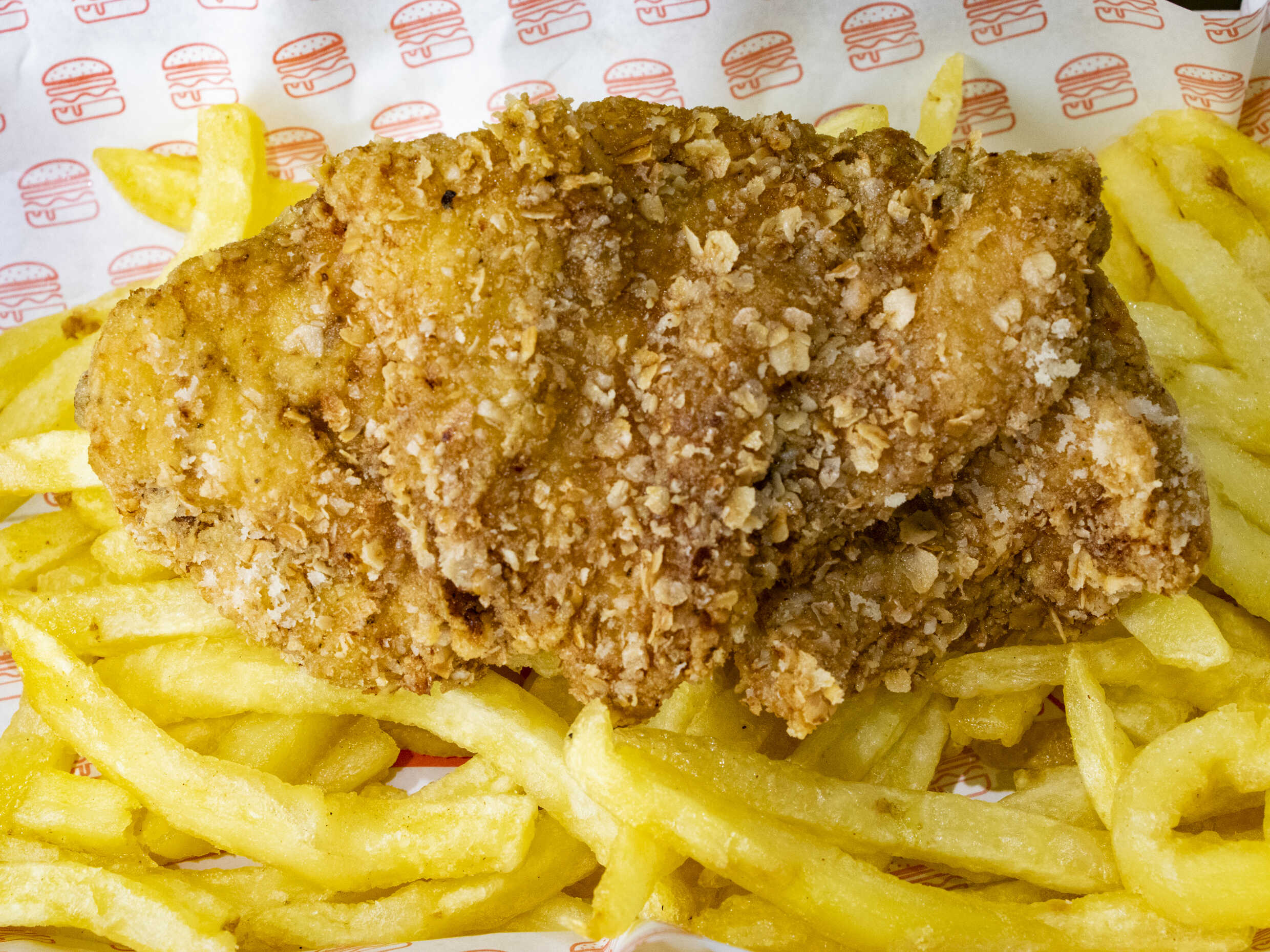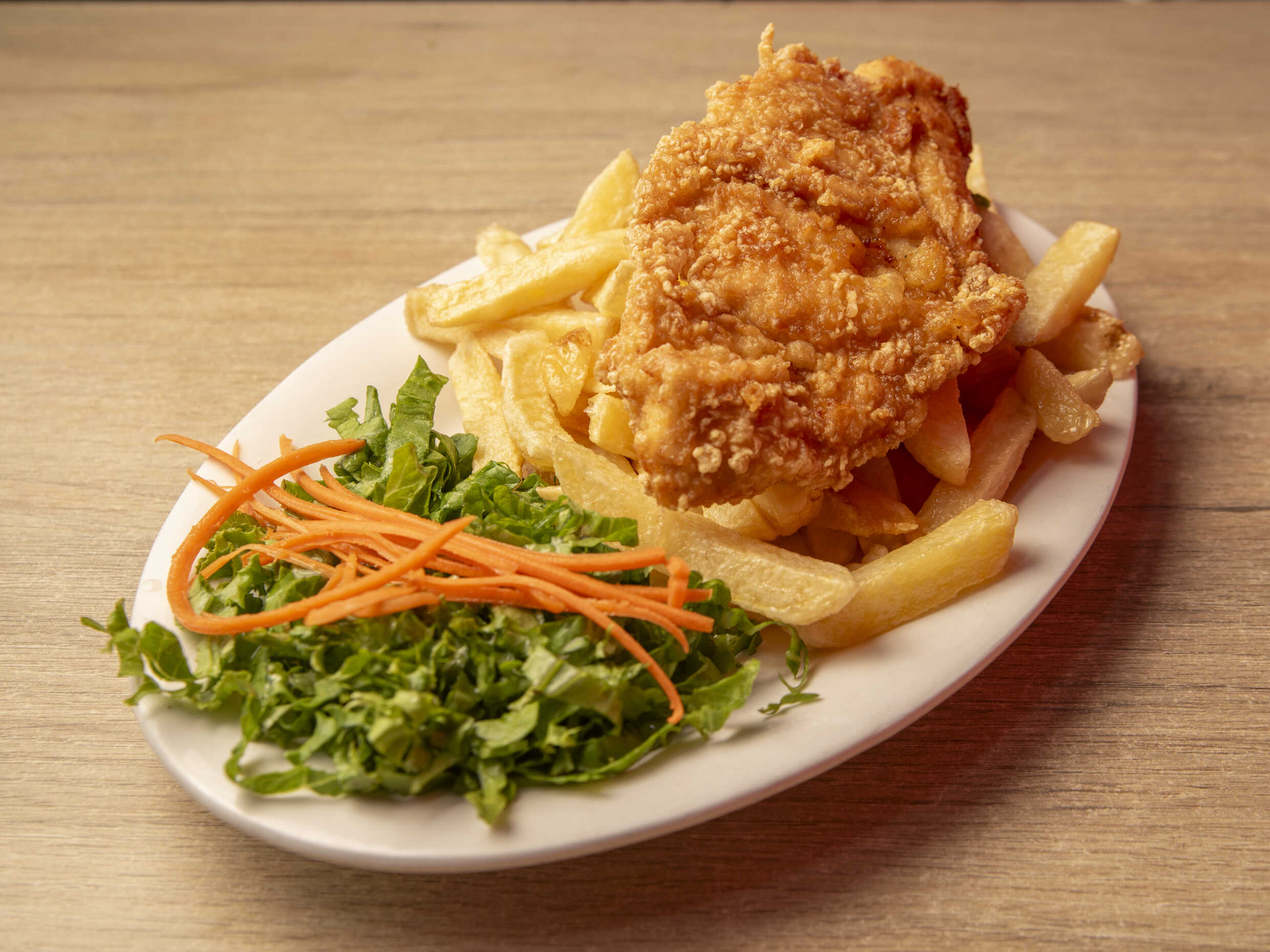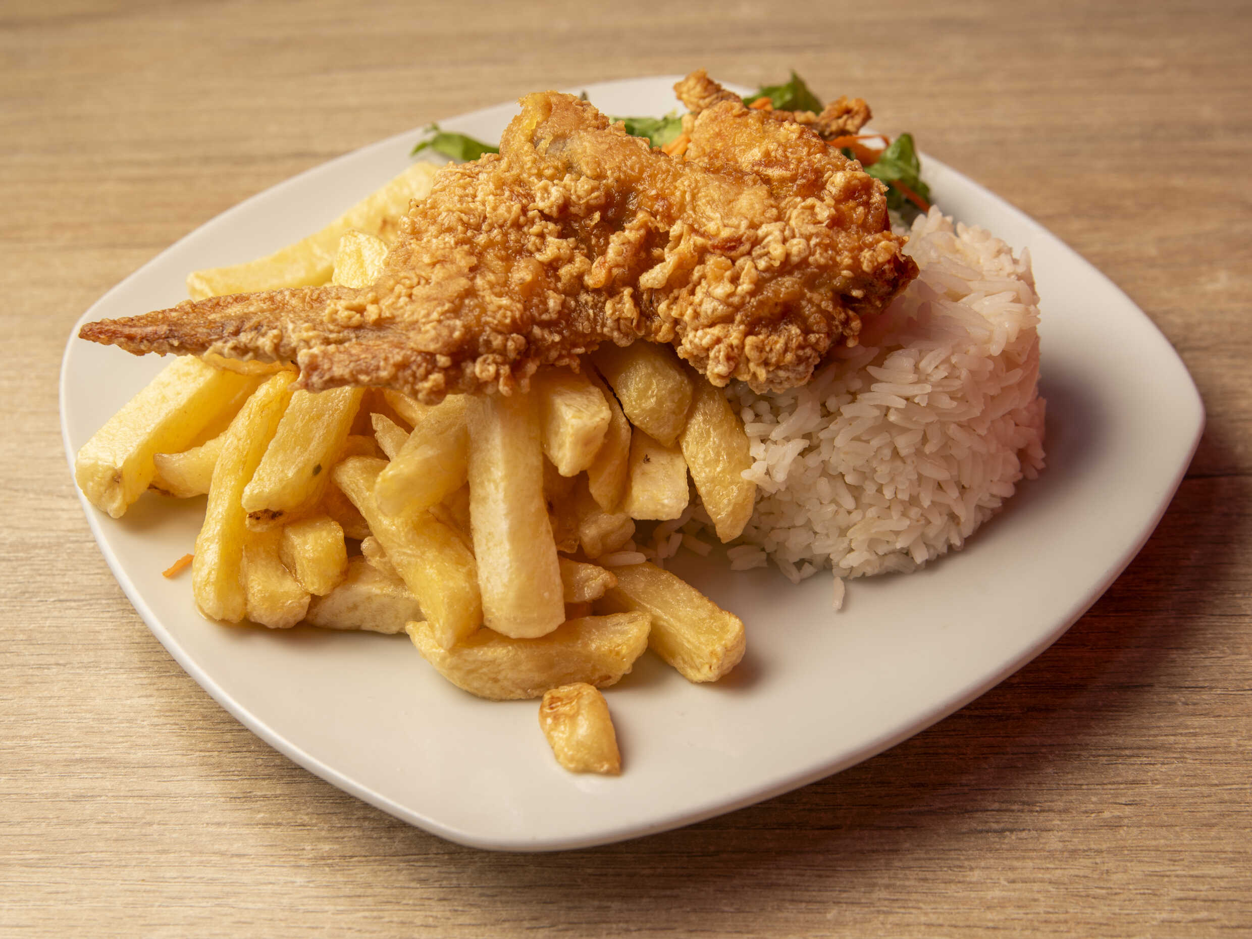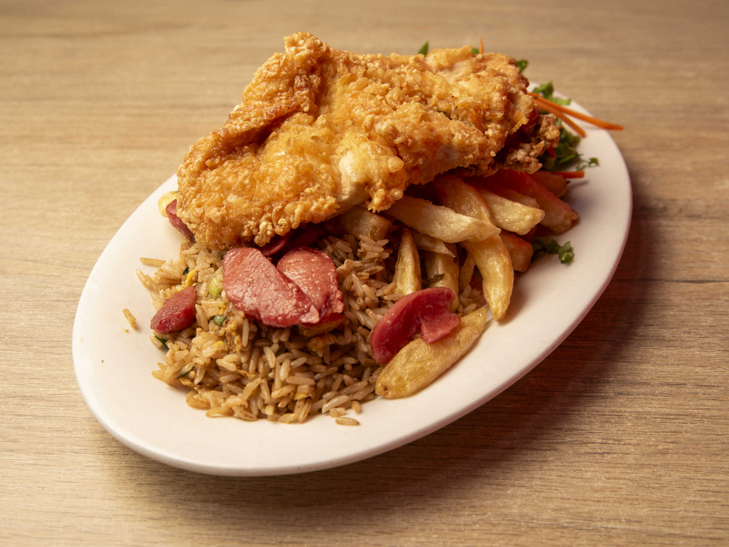 Pechuga de pollo XXL, arroz blanco, papas fritas y ensalada fresca.