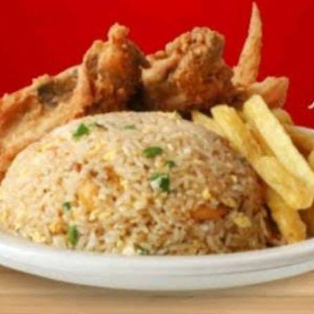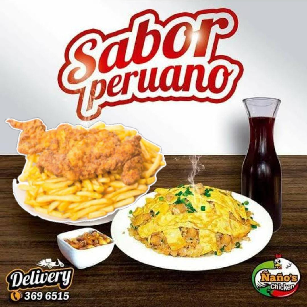 Crujiente ala broaster, papas fritas, arroz chaufa, ensalada fresca y cremas.
