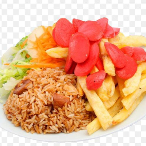 Crujiente encuentro broaster, 1 porción de papas a la francesa fritas (125 g), arroz chaufa, ensalada fresca (lechuga y zanahoria) y cremas (mayonesa, mostaza y piña). Salsa de la casa (porción personal).
