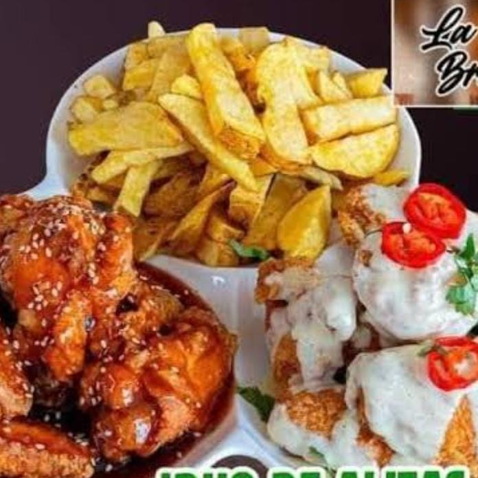 Crujiente ala broaster, papas fritas, arroz blanco (opcional), ensalada fresca y cremas.