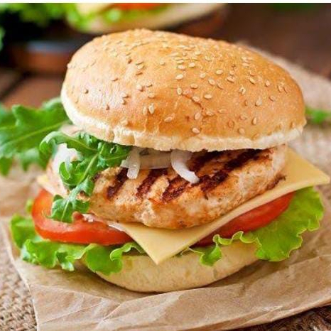 Hamburguesa de pollo, papas fritas, ensalada fresca y cremas.
