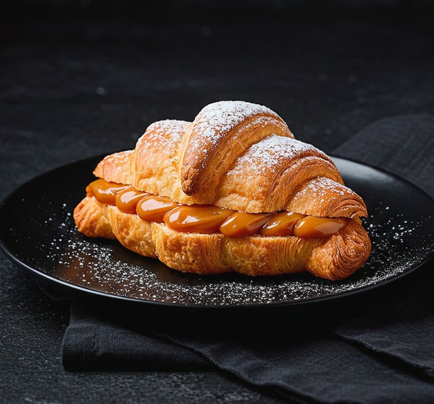 Croissant con huevo revuelto, queso y jamón de cerdo.
