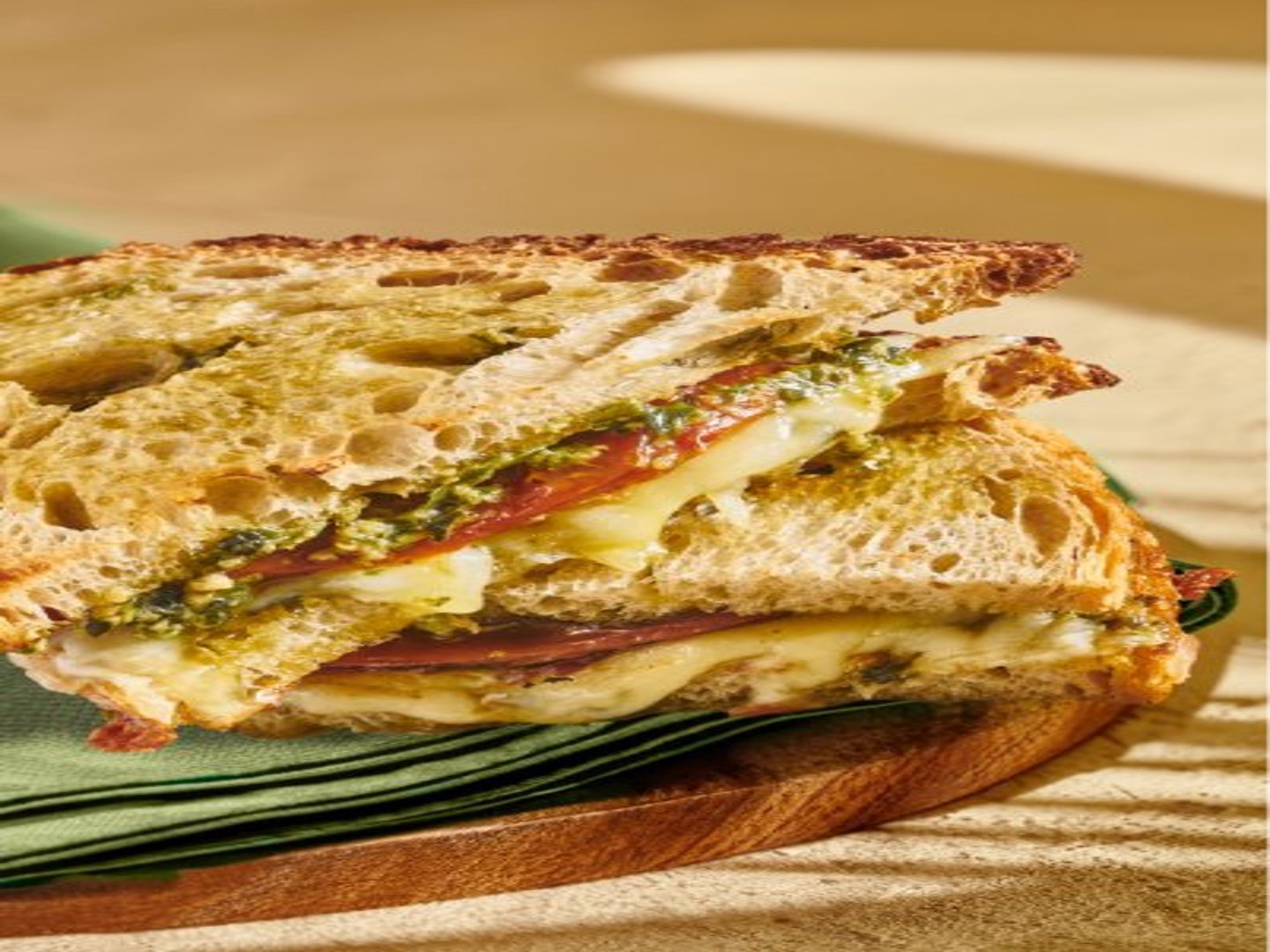 Sandwich en pan campesino con queso mozzarella, tomate confitado y pesto.