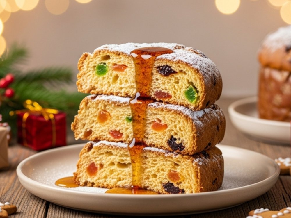 Tajadas de panetón doradas al estilo francés, con frutas cristalizadas, azucar pulverizada y un Syrup.