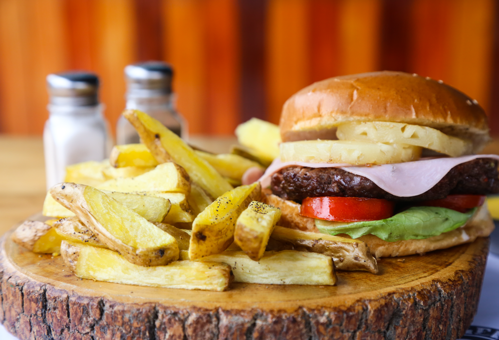 Carne, queso, piña en rodaja y papas fritas o al hilo