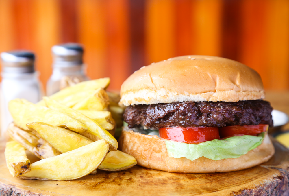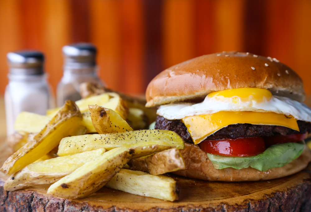 Hamburguesa a la plancha, queso, huevo frito y papas fritas o al hilo.