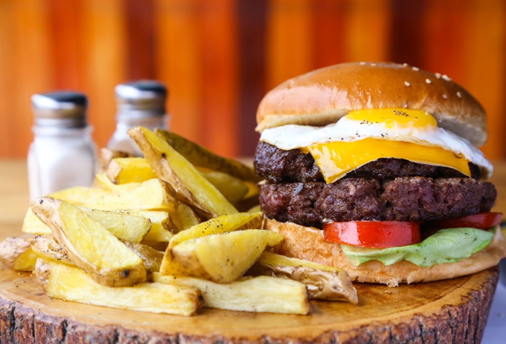 2 carnes, queso, huevo frito y papas fritas o al hilo.