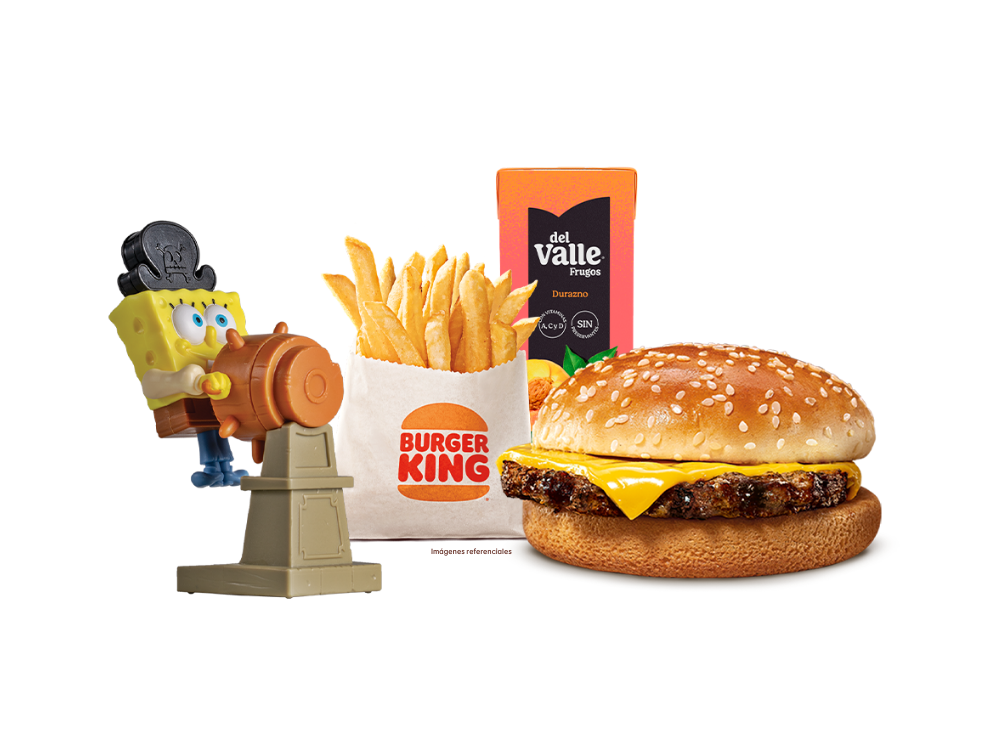 Hamburguesa 100% carne de res a la parrilla, queso, cebollitas crujientes, BBQ, tomate, lechuga y mayonesa, 1 Papa Jr y 1 Bebida Personal