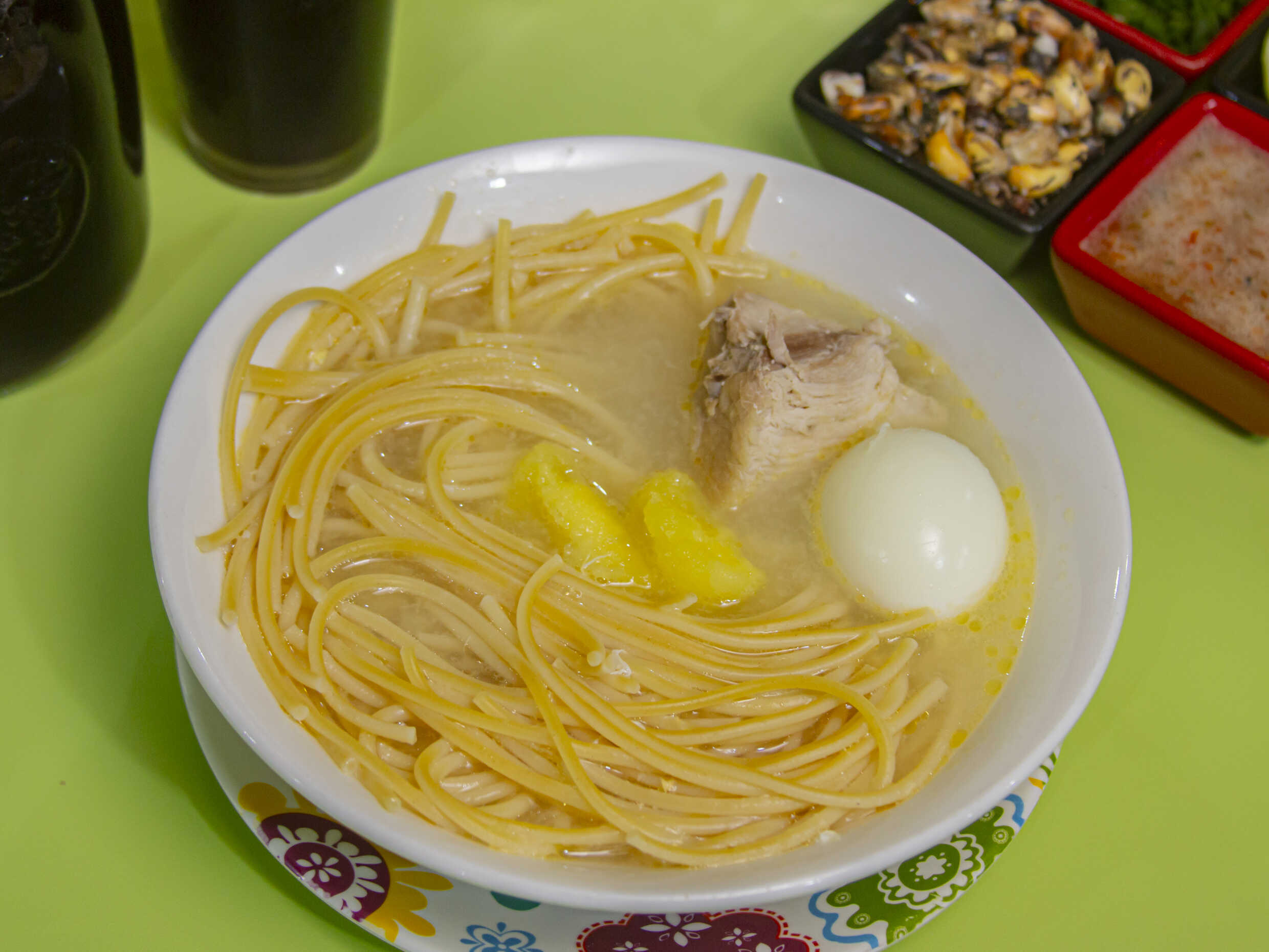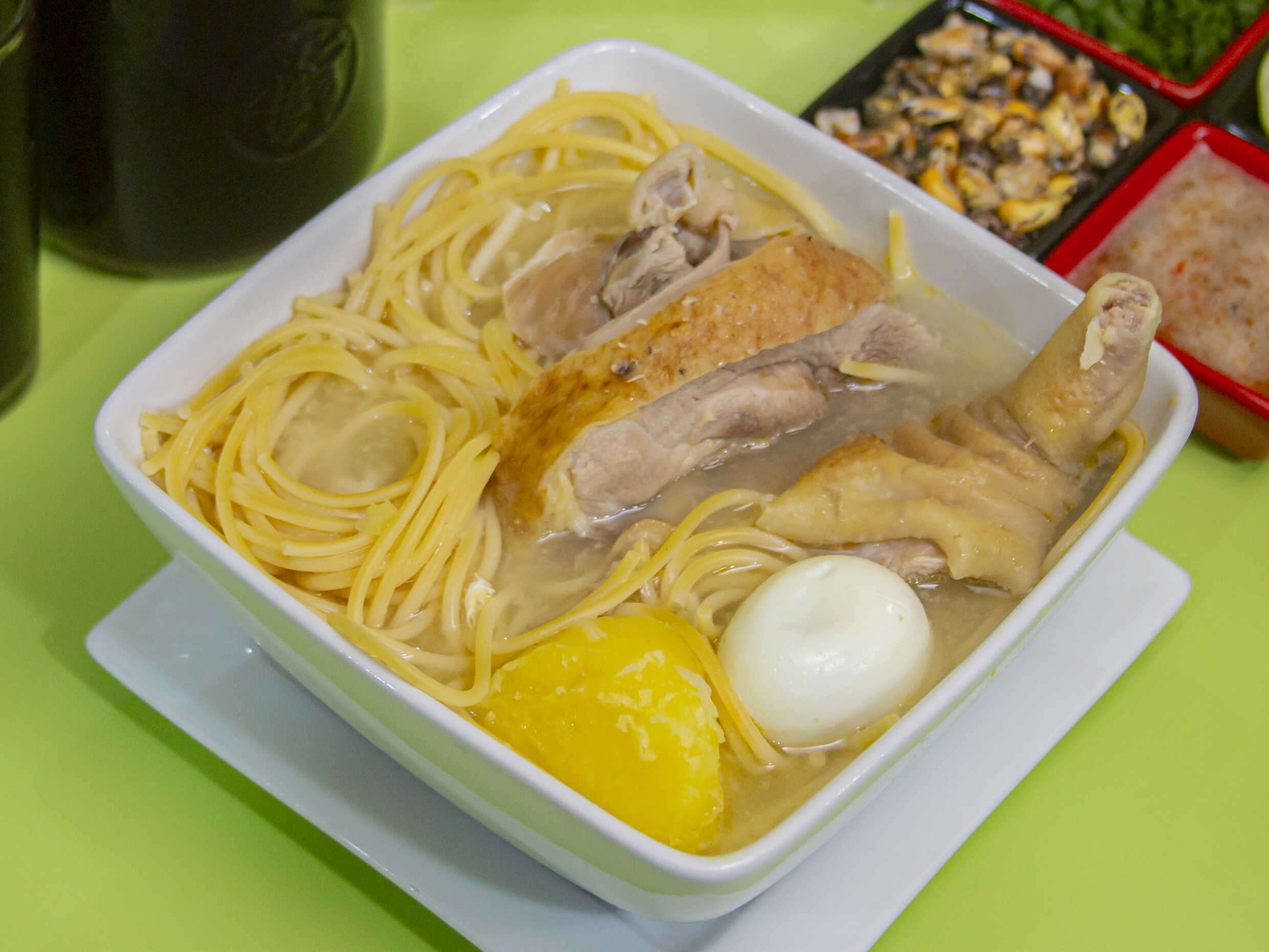 Gallina, fideos , papa, huevo,kion, cebolla China , limón y canchita