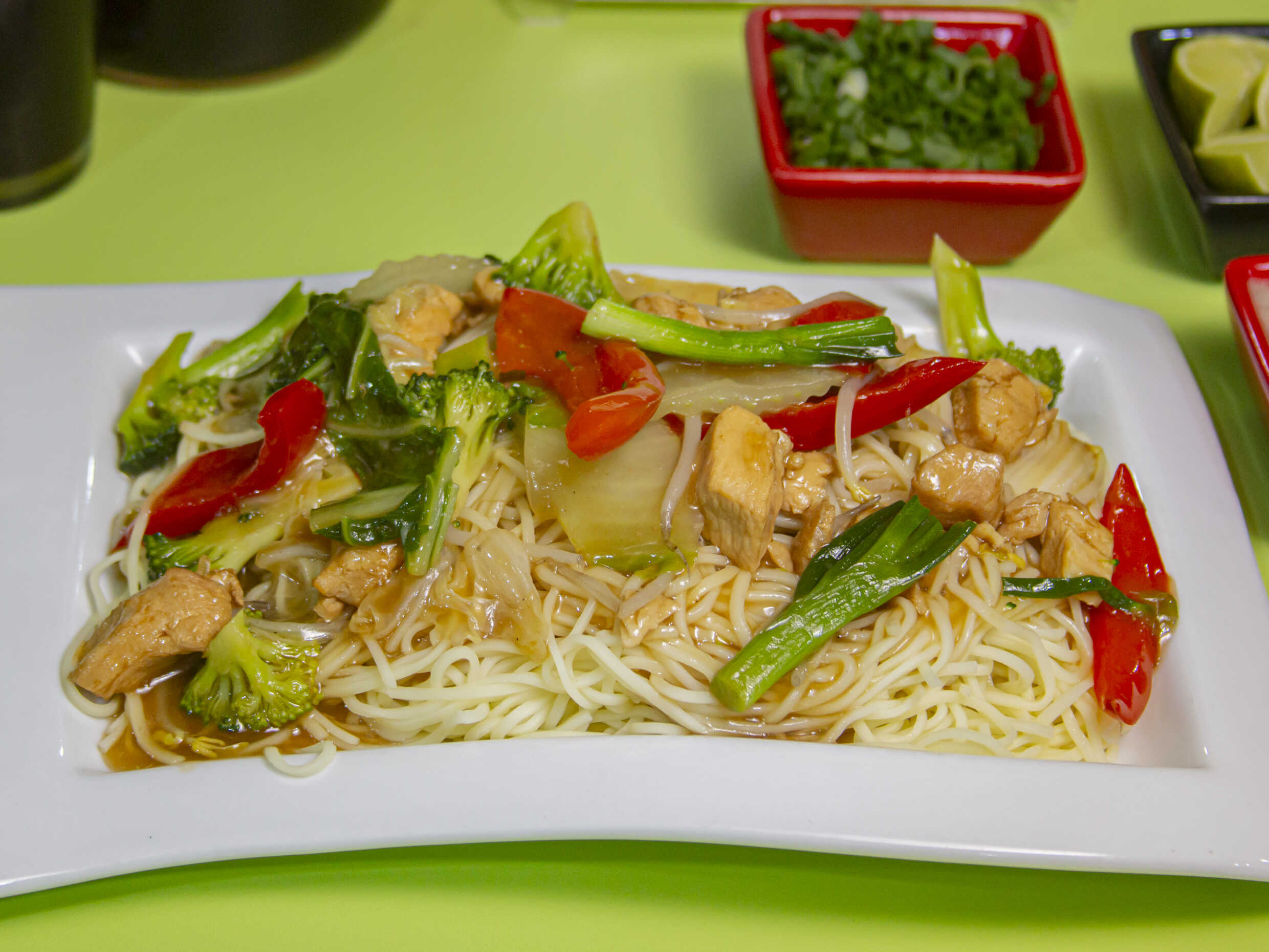 Tallarines, trozos de pollo y verduras chinas.