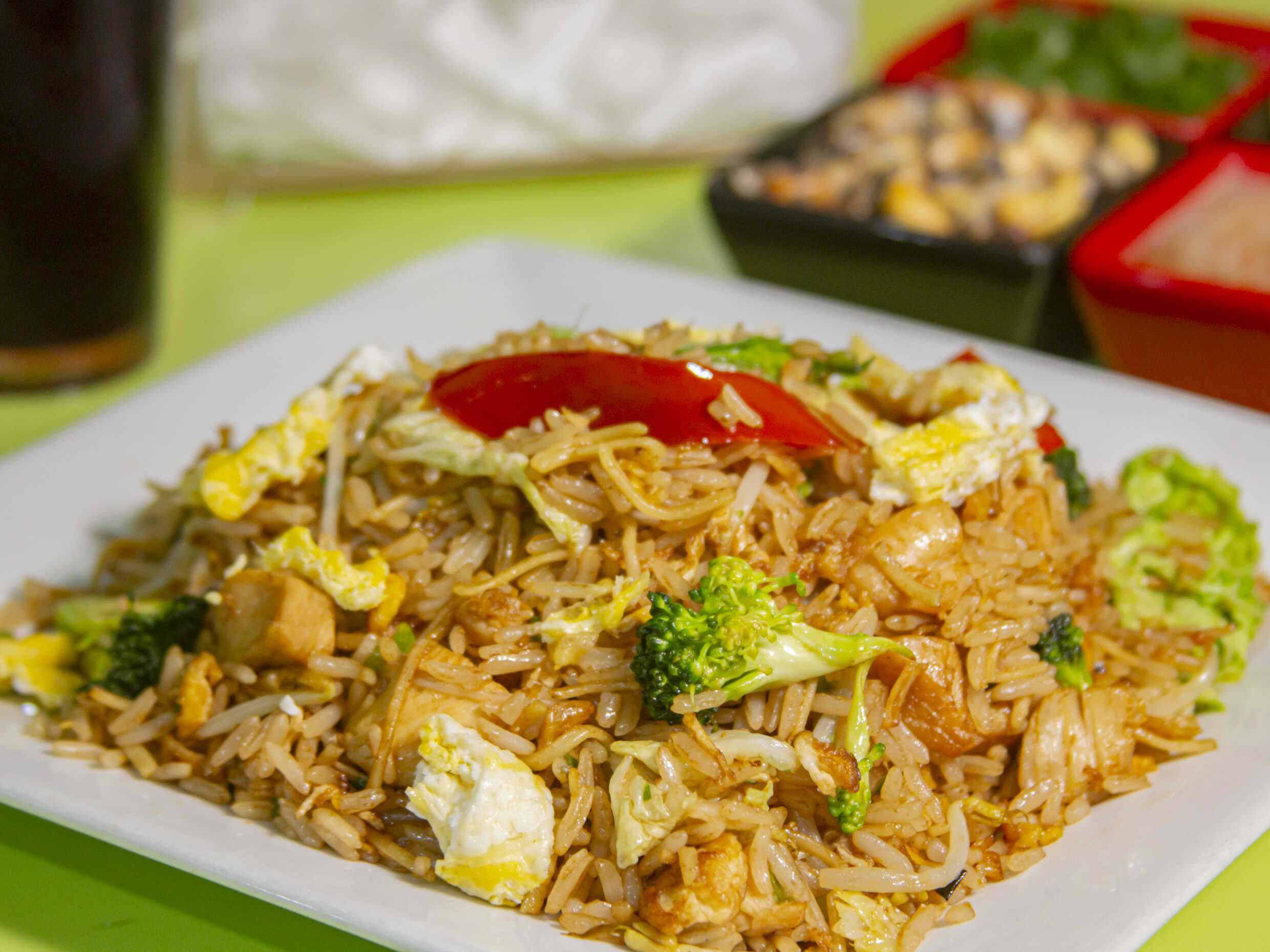 Chaufa con verdura ,brócoli ,col,pimiento,frejol chino,fideos chino,arroz y pollo.,pollo y