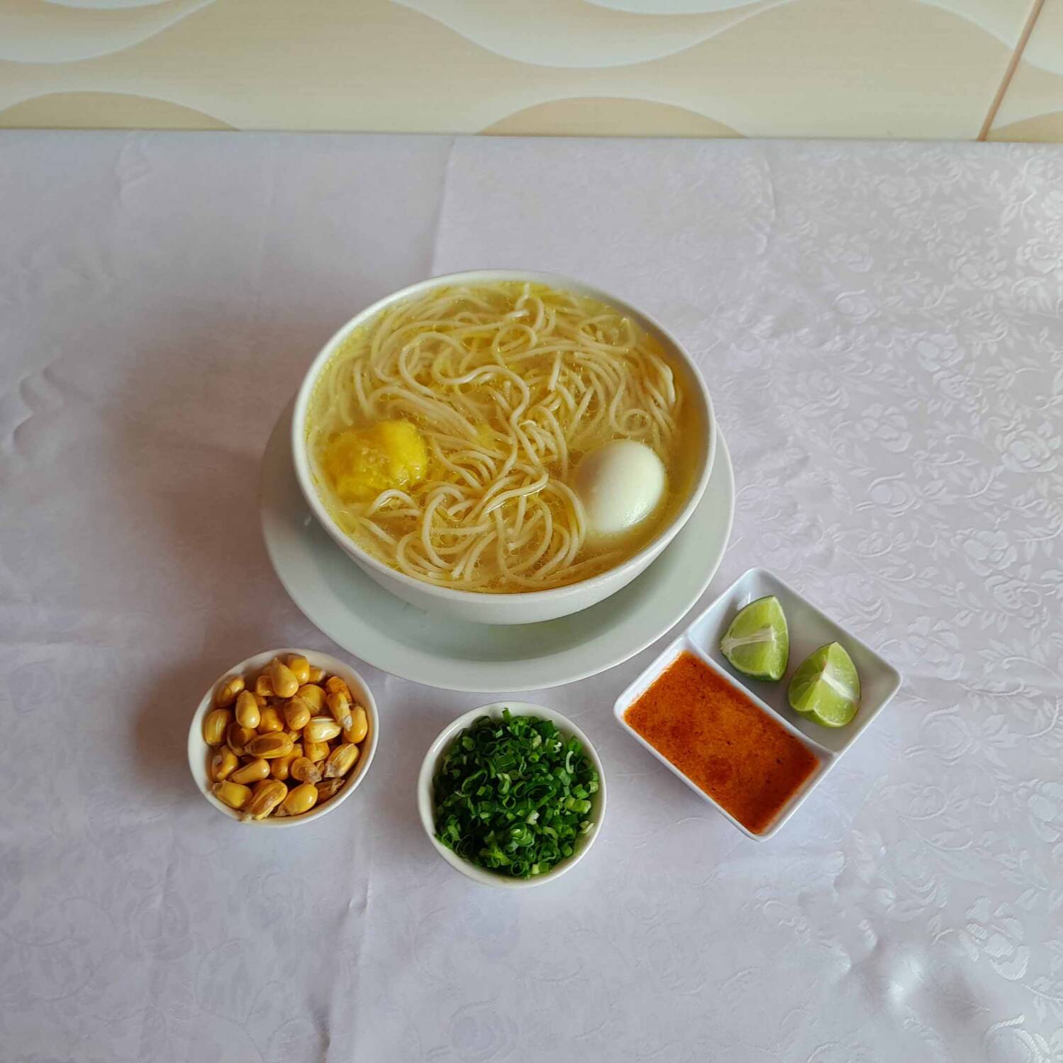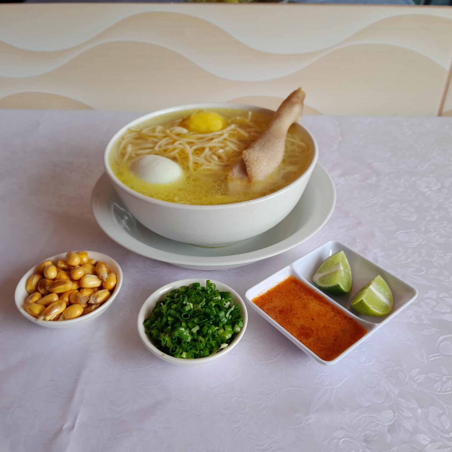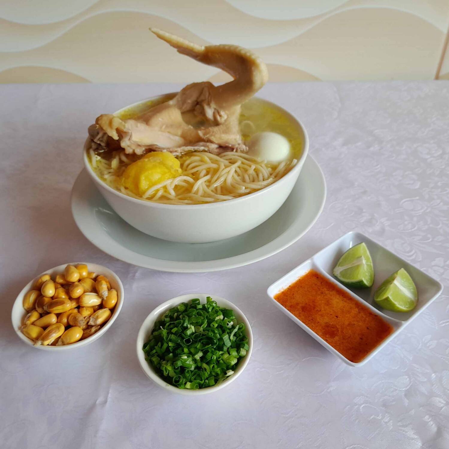 Concentrado de gallina negra, cocido a fuego lento, con fideos al dente, papa y huevo duro.