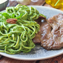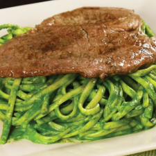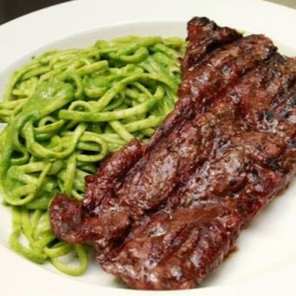 Jugoso churrasco acompañado de cremosos tallarines verdes al estilo peruano, con intenso sabor a espinaca, albahaca y queso